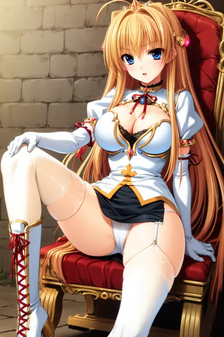 tiara, hair ornament, dress, cleavage cutout, short sleeves, elbow gloves, garter straps, thighhighs, knee boots, cross-laced footwear
