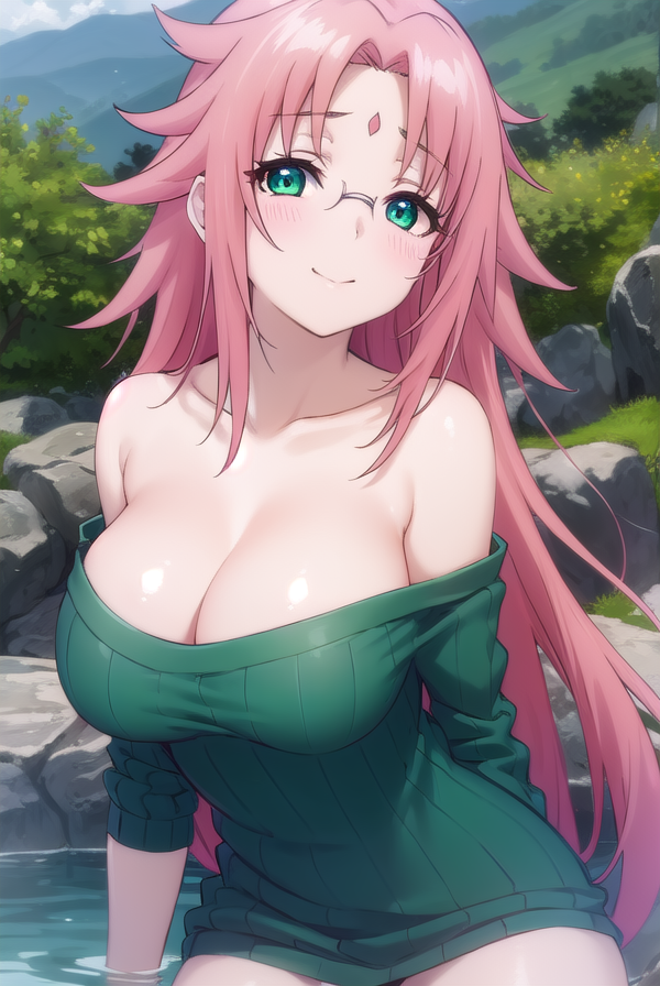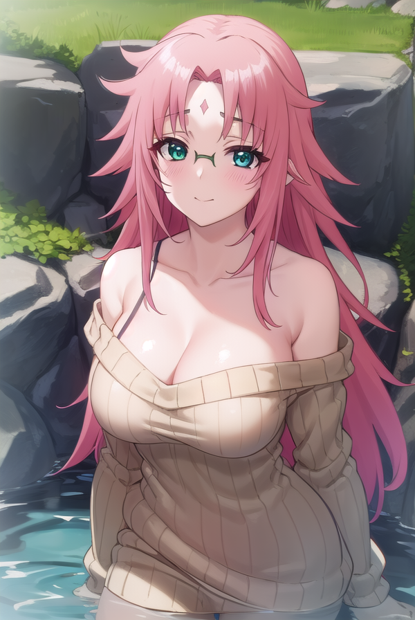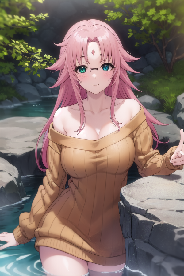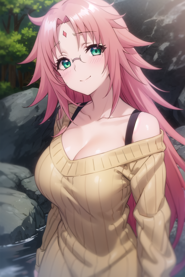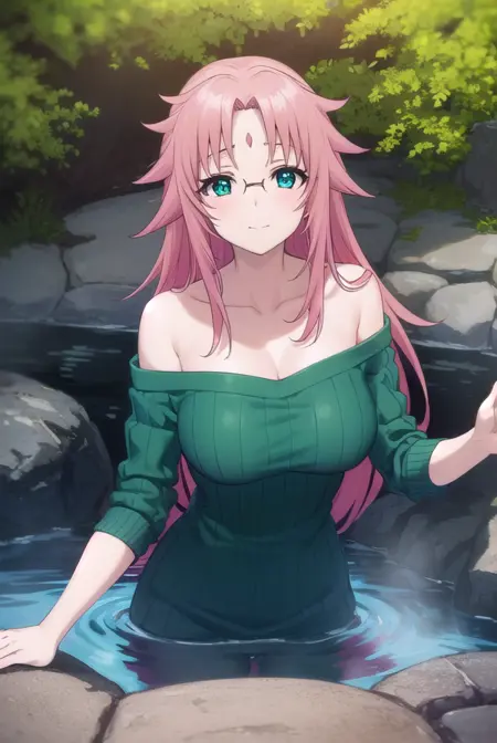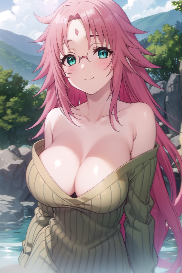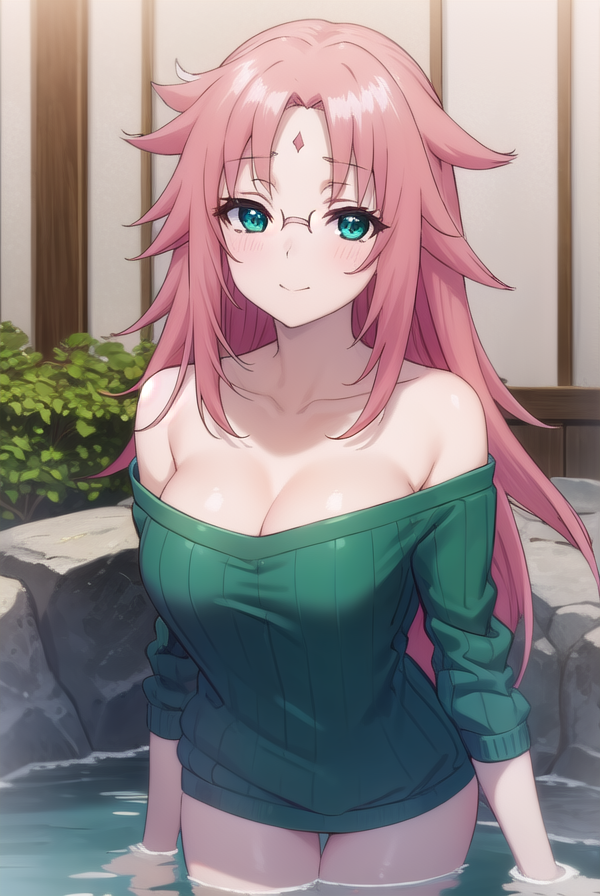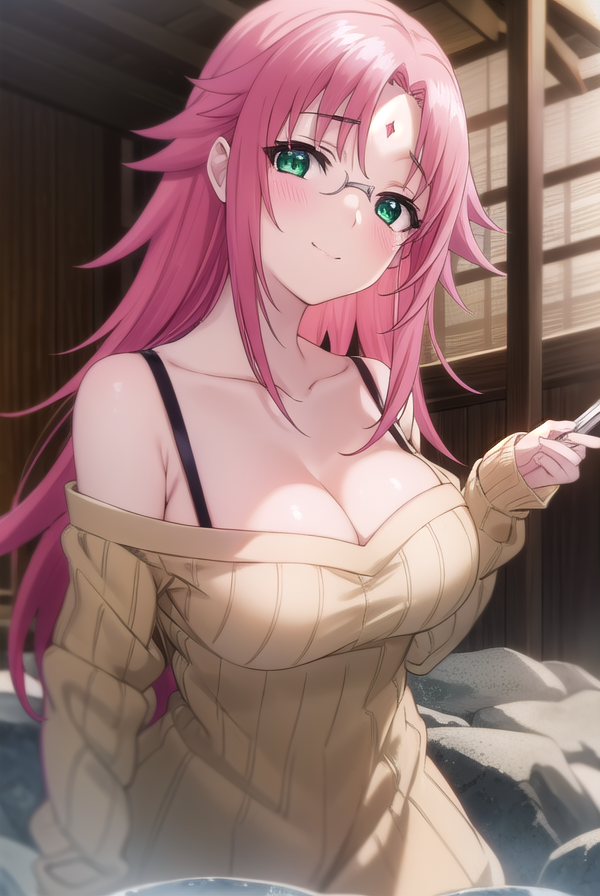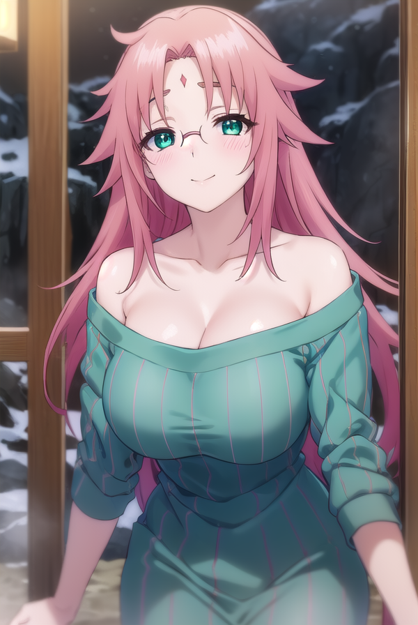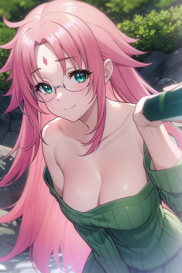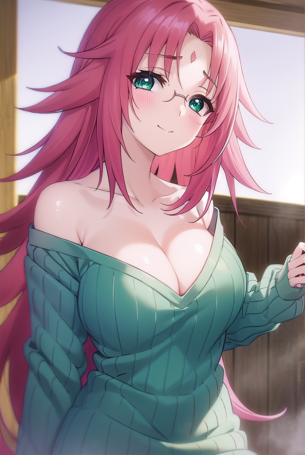 nonko arahabaki, long hair, (green eyes:1.3), pink hair, glasses, (parted bangs:1.5), facial mark, forehead mark,
