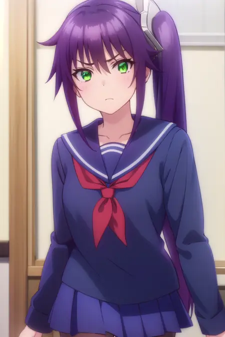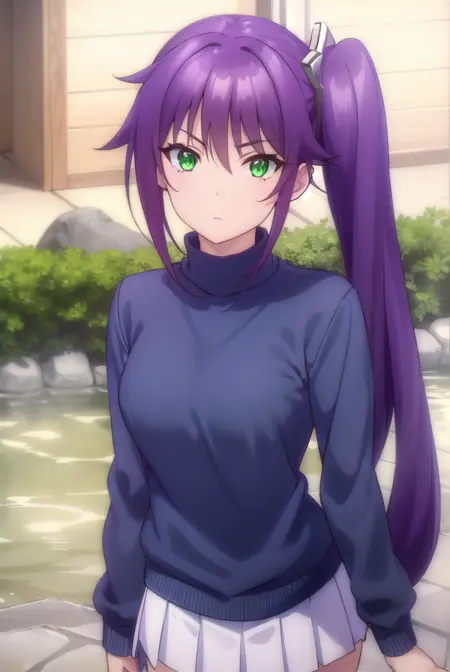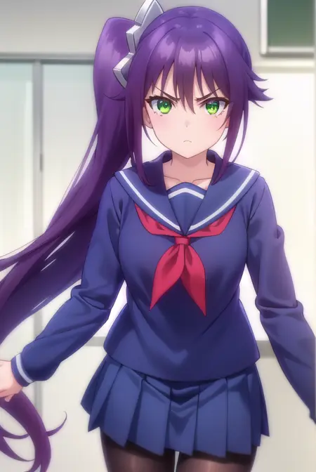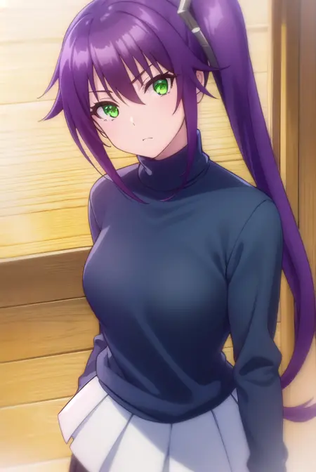 sagiri ameno, long hair, hair between eyes, very long hair, (green eyes:1.3), purple hair, side ponytail,