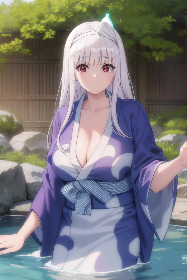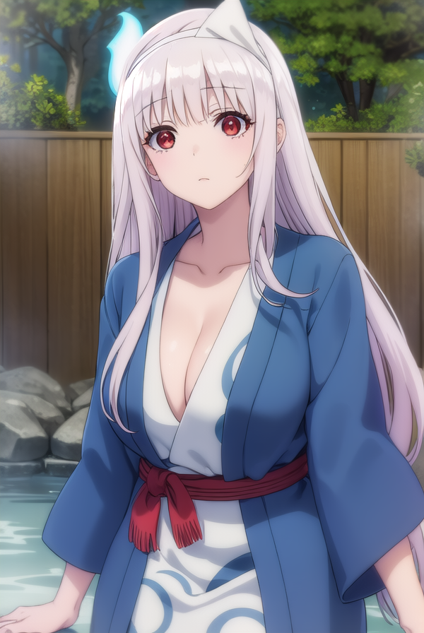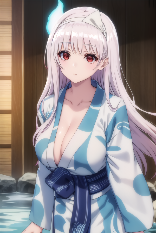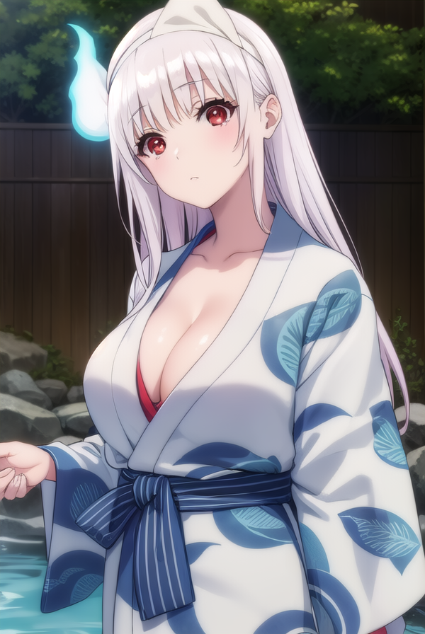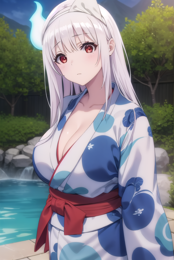 cleavage, japanese clothes, kimono, ghost, yukata, white kimono, triangular headpiece, albino, bath yukata, hanten \(clothes\),