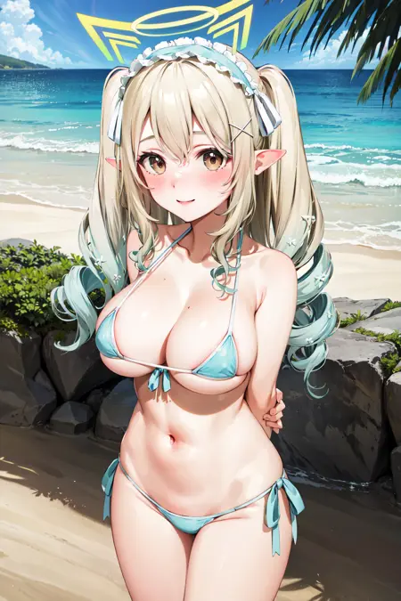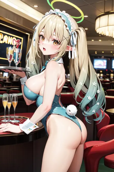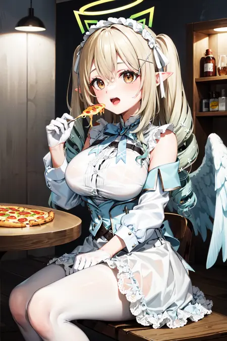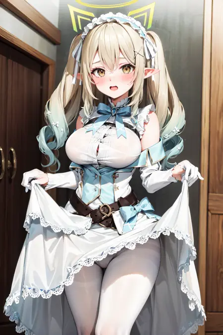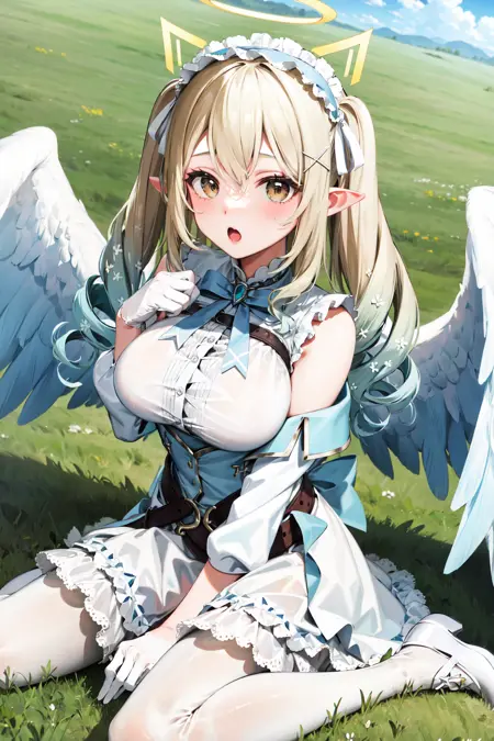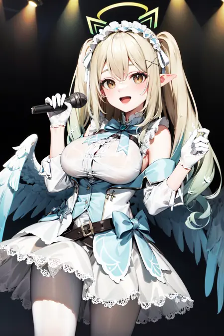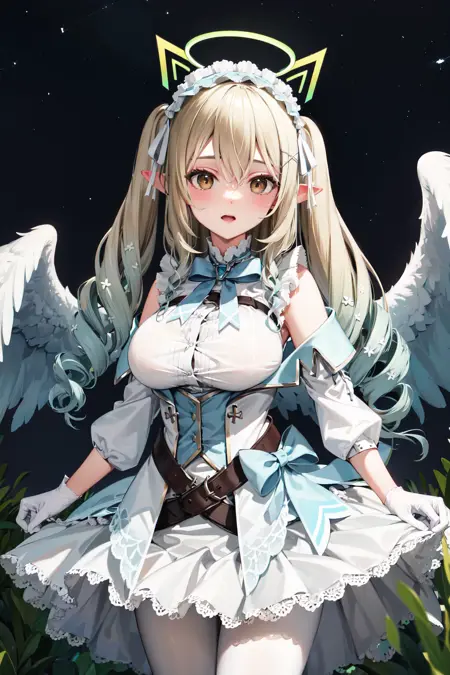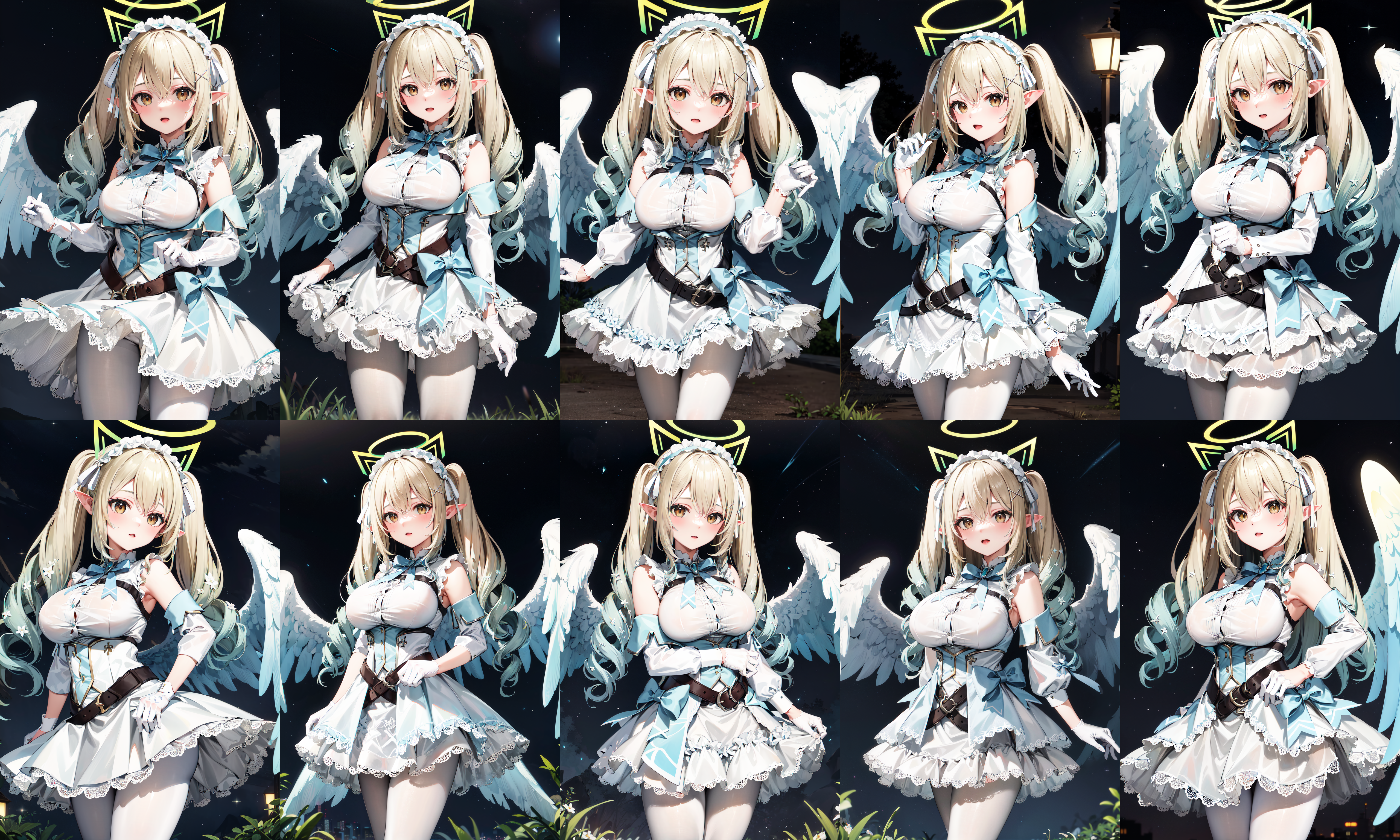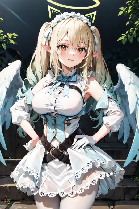 outfit1aananase, long hair, twintails, drill hair, halo, fake animal ears, pointy ears, hairband, x hair ornament, large breasts, feathered wings, white dress, bowtie, belt, sleeveless, detached sleeves, white gloves, white pantyhose