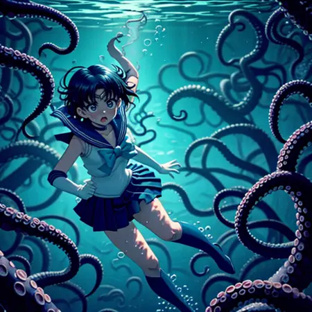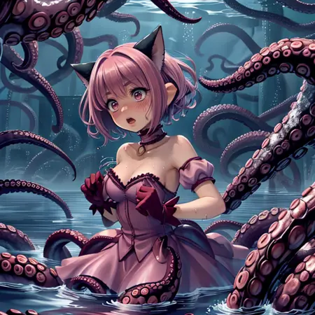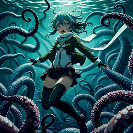 我想创作一个场景,描绘一个人被触手抓住并包围的画面。然而,使用DALL-E生成图像时,很难呈现出相互缠绕的触手效果。因此,为了节省时间,我专注于表现人物被触手包围的场景。尽管这可能看起来有点不完整,但我通过在图像中加入大量触手来弥补,所以触手的数量相当多。