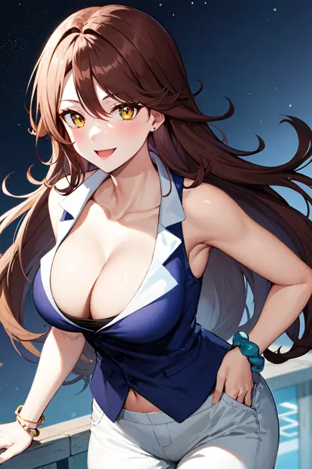 1걸, 솔로, 긴 머리, 갈색 머리, 굵은 가슴선, 보석, 팔찌, 노란 눈, 하얀 바지, 파란 카라비너, 민소매, 써머리 레이 노리에가