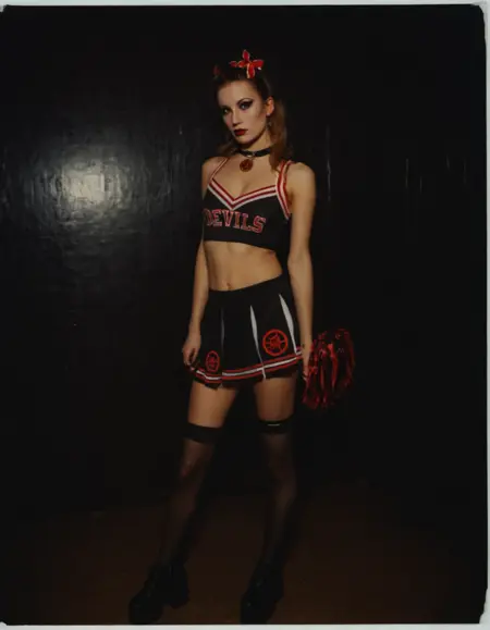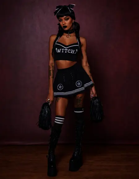 Wearing a Dollskill Cheerleader Costume, featuring a red crop top with bold black letters spelling "DEVILS 666," intersected by white geometric lines throughout. The bottom is a matching red mini skirt with white accents and pentagram designs on each side.