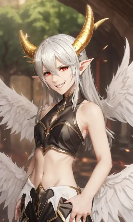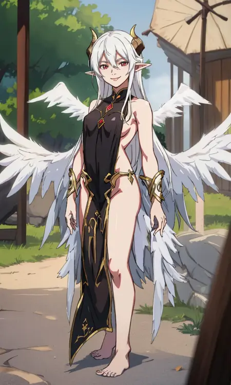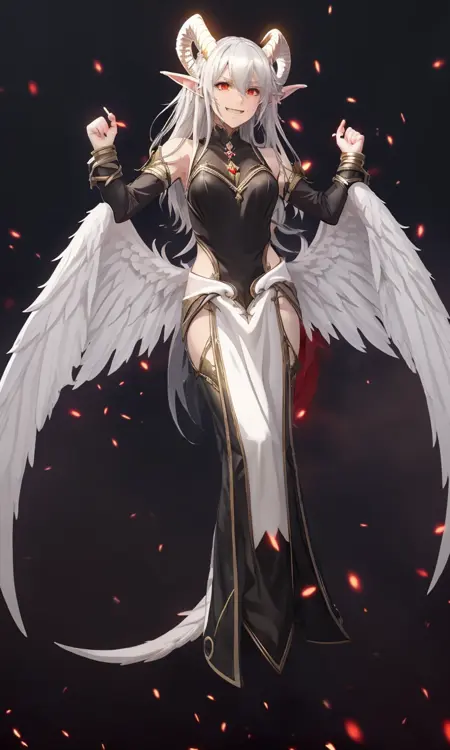 キーワード:エルフの耳、白髪、翼。衣装は自由に設定できますが、キーワードのみ指定した場合は標準的な衣装をデフォルトとします。