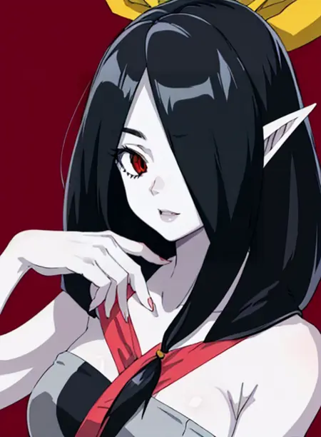 mihasa、尖った耳、片目にかかる髪、黒髪、赤い目、白い肌、リボン