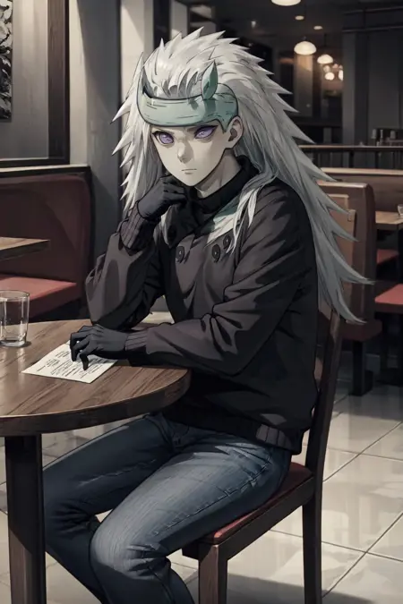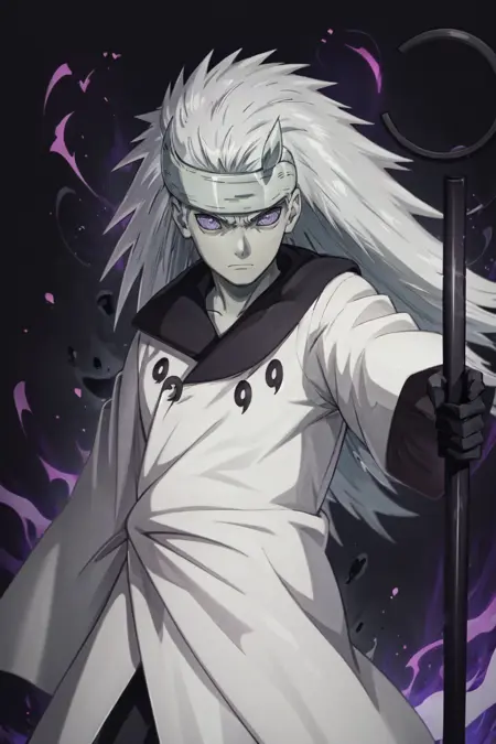 プロンプト:マダラ、淡い肌、長い髪、灰色の髪、額当て、黒い球、紫色の目
