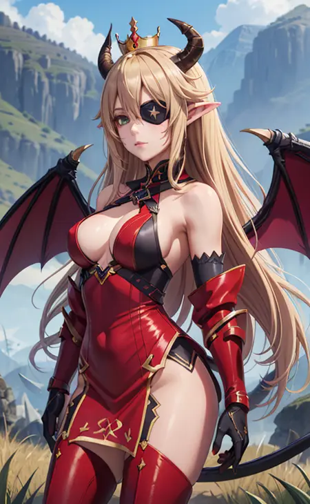| 训练词汇 | long hair, breasts, bangs, blonde hair, thighhighs, gloves, dress, hair between eyes, bare shoulders, medium breasts, very long hair, green eyes, tail, boots, wings, horns, sleeveless, pointy ears, black gloves, elbow gloves, armor, high heels, sideboob, thigh boots, eyepatch, red dress, demon girl, crown, gauntlets, red footwear, demon tail, red gloves, high heel boots, demon wings, red thighhighs, ahoge已复制! |