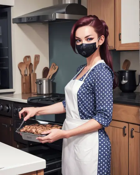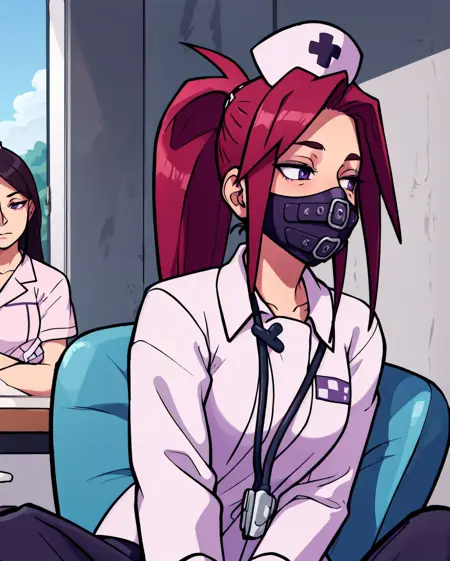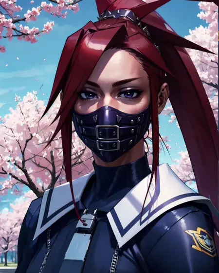 helper tags: long red spiky hair, ponytail, violet/purple eyes, facemask