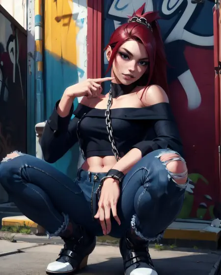 • helper tags: long red spiky hair, ponytail, violet/purple eyes, facemask