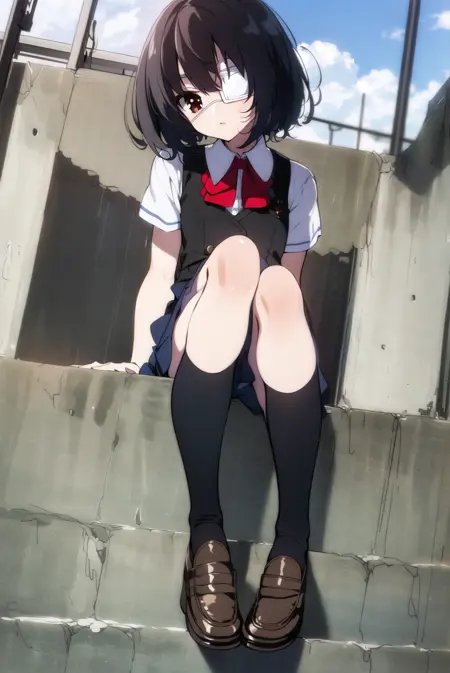 基础提示词为 misaki mei, 校服, 黑色外套, 布洛克鞋, 过膝袜, 医疗眼罩。