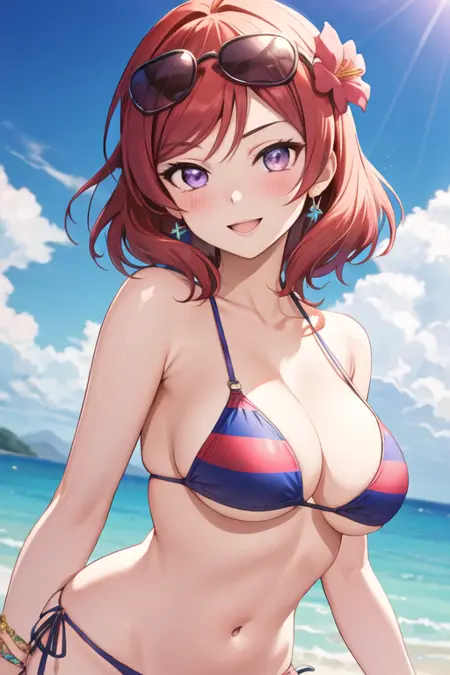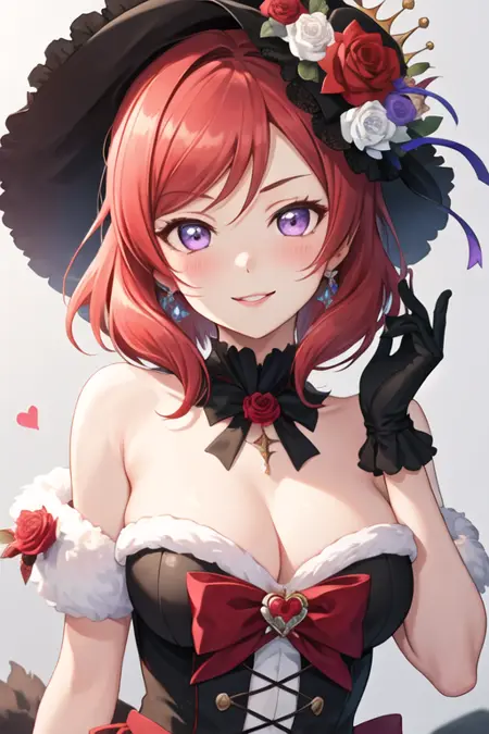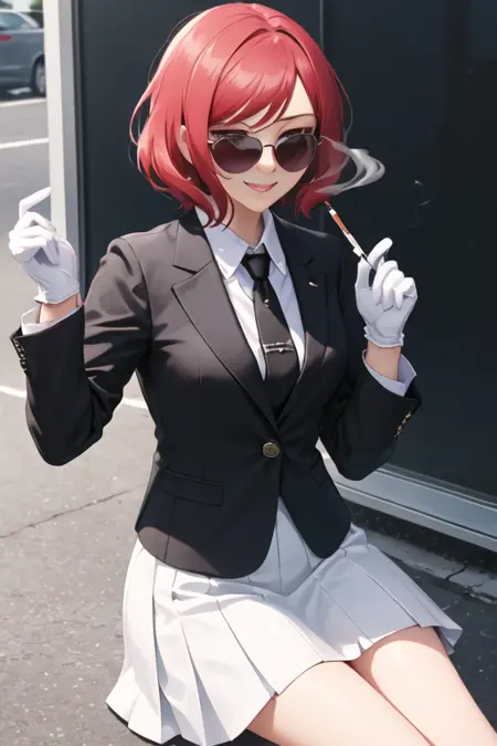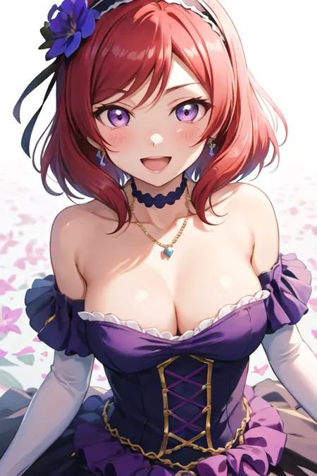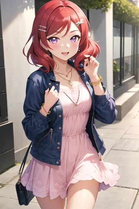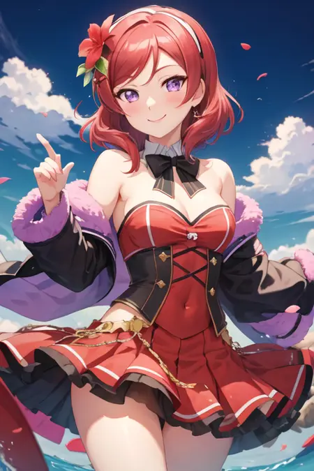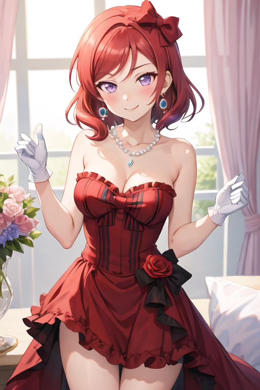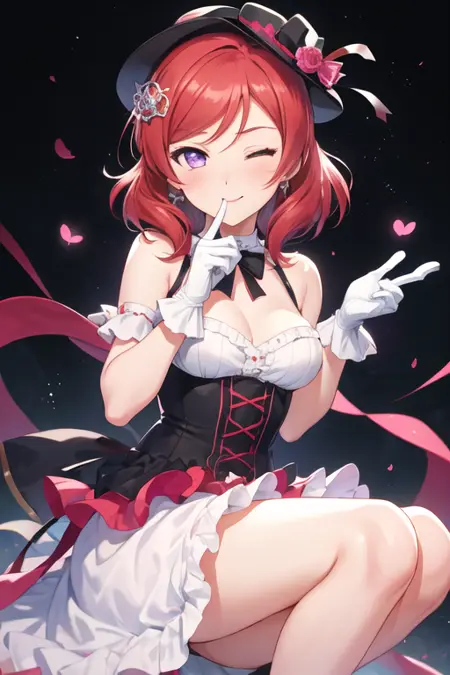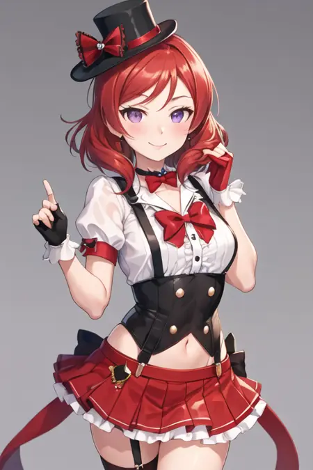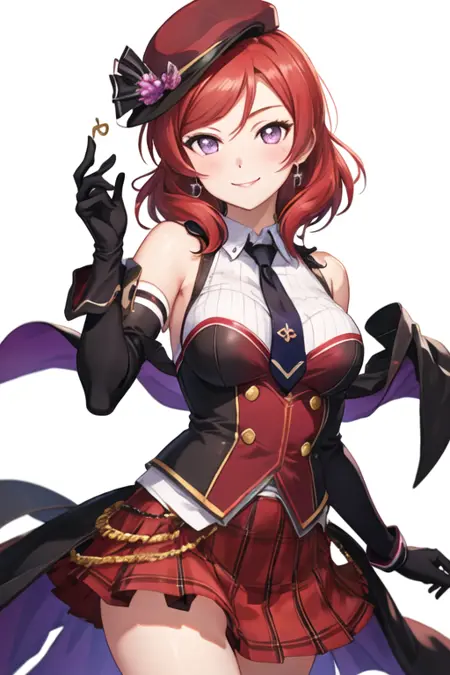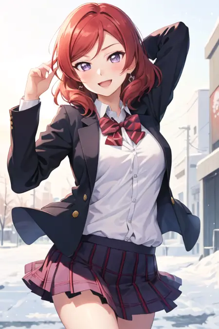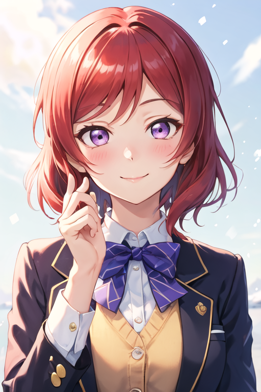 The trigger word is nishikino_maki_lovelive, and the recommended tags are best quality, masterpiece, highres, solo, {nishikino_maki_lovelive:1.15}, red_hair, purple_eyes, blush, short_hair, smile.
