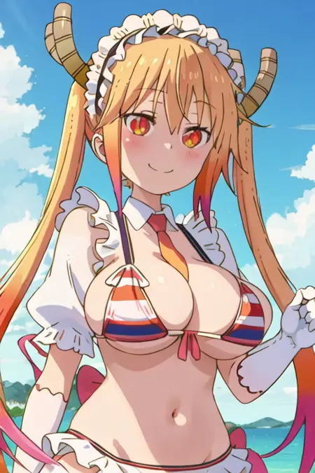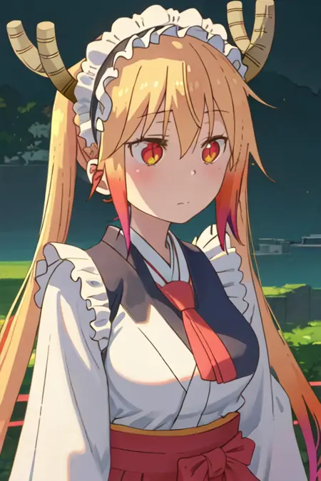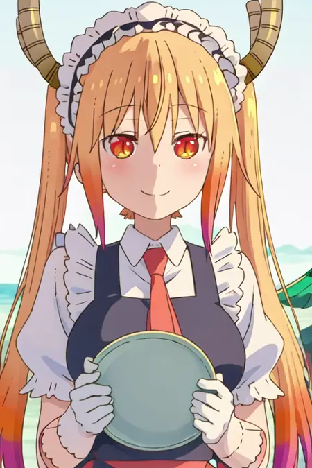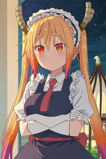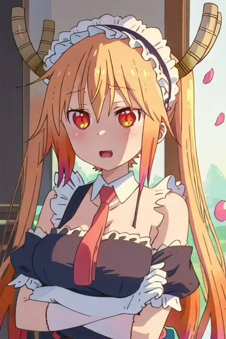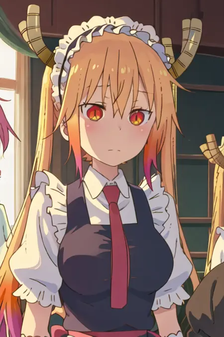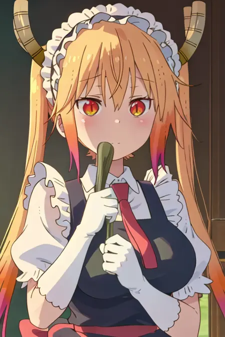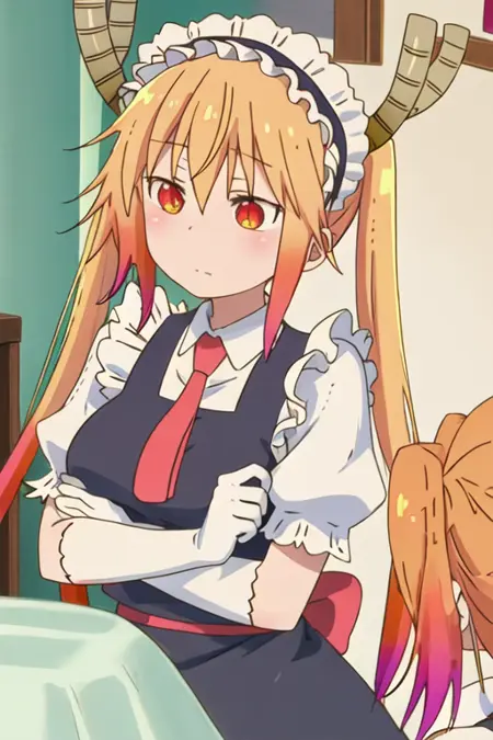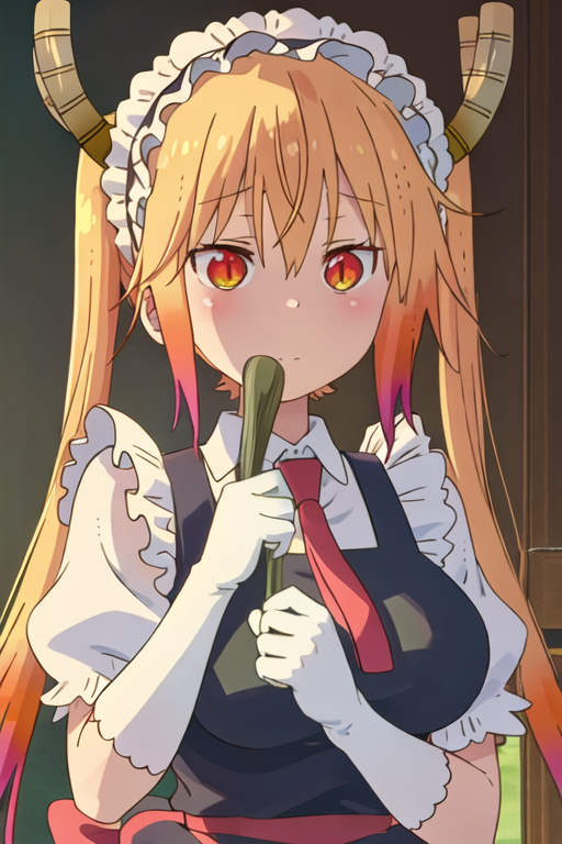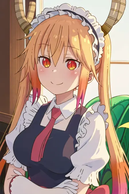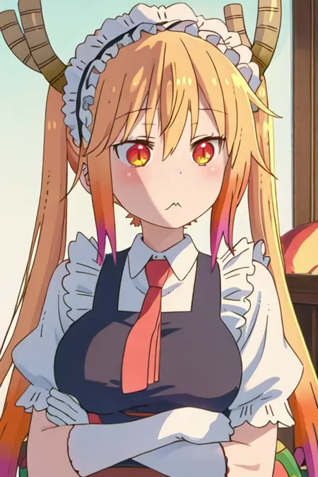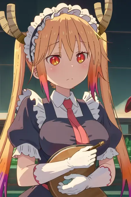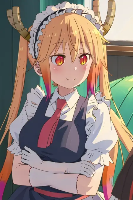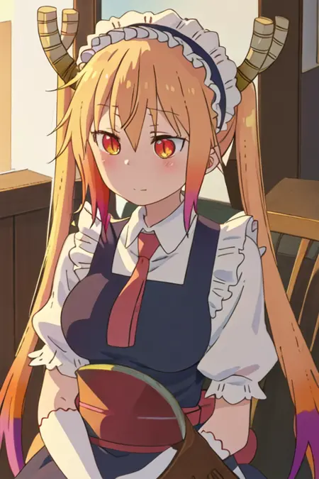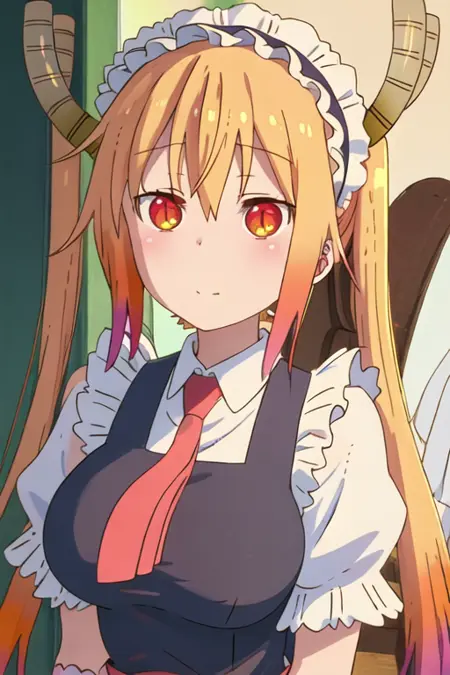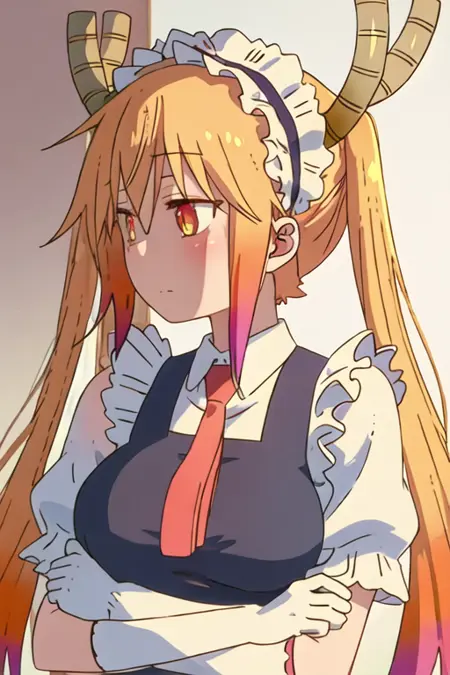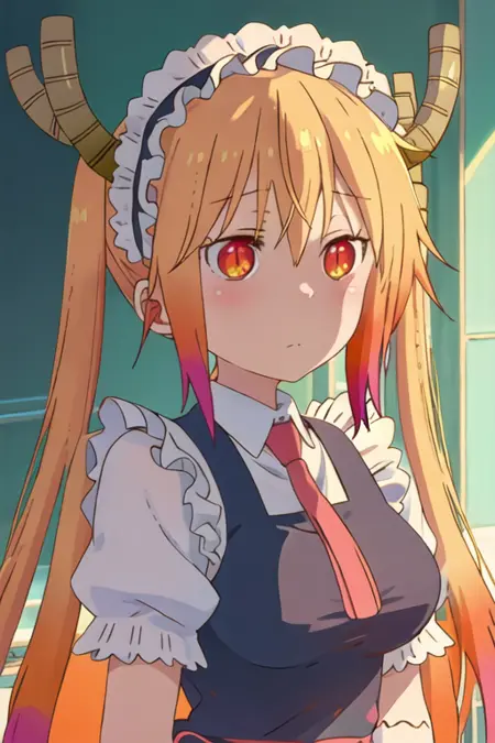 The trigger word is tooru_kobayashisanchinomaidragon, and the recommended tags are best quality, masterpiece, highres, solo, {tooru_kobayashisanchinomaidragon:1.15}, blonde_hair, horns, dragon_horns, long_hair, dragon_girl, maid_headdress, twintails, multicolored_hair, blush, gradient_hair, necktie, red_eyes, closed_mouth, red_necktie, orange_eyes, hair_between_eyes, breasts, orange_hair.