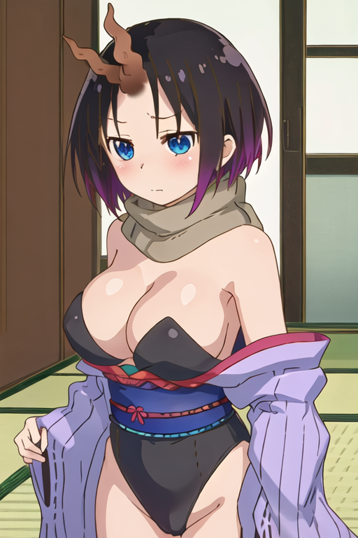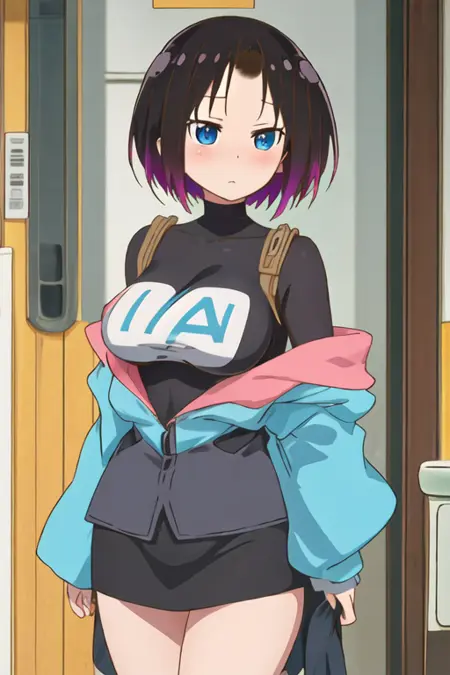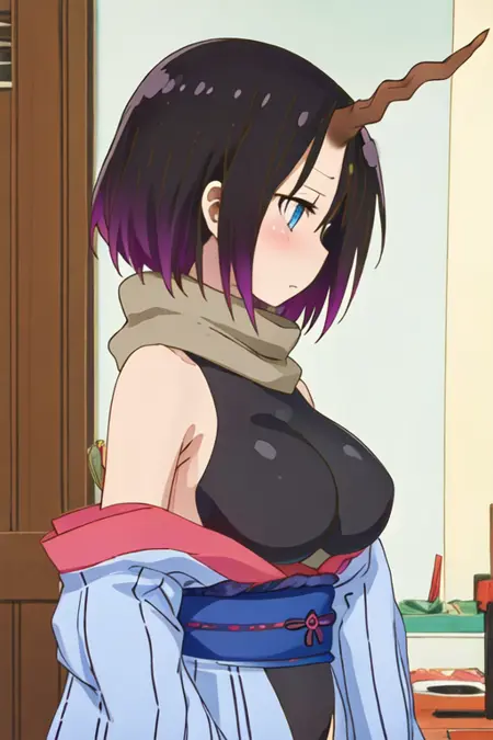 The trigger word is elma_kobayashisanchinomaidragon, and the recommended tags are best quality, masterpiece, highres, solo, {elma_kobayashisanchinomaidragon:1.15}, black_hair, multicolored_hair, purple_hair, gradient_hair, short_hair, blue_eyes, blush, breasts, large_breasts.