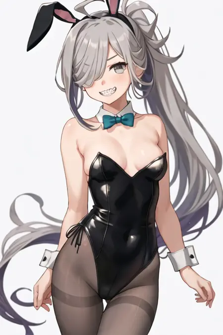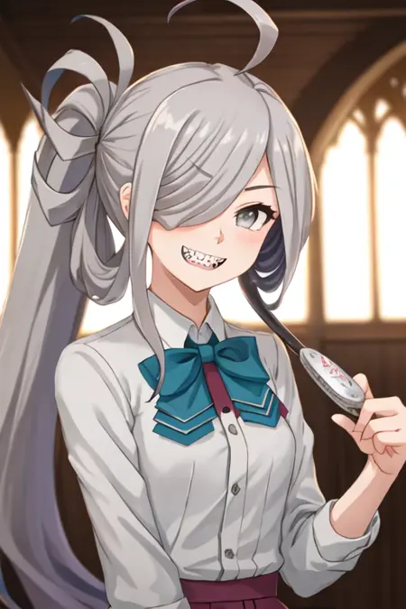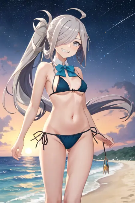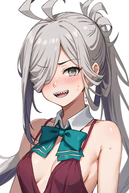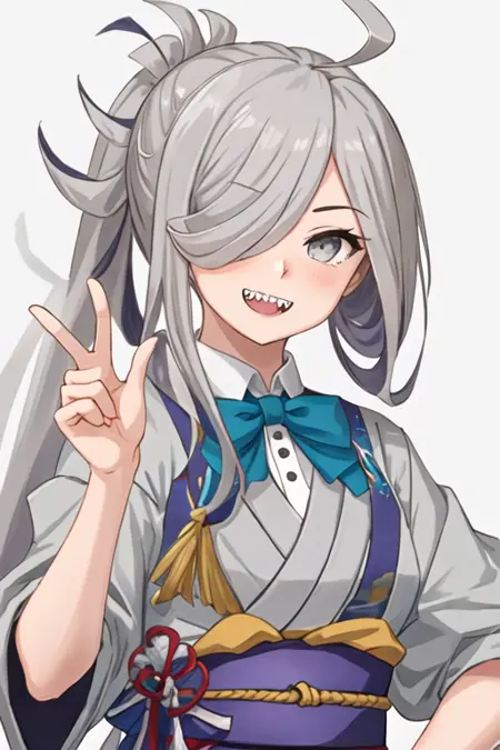 触发词为 asashimo_kantaicollection,推荐标签为:best quality, masterpiece, highres, solo, {asashimo_kantaicollection:1.15}, hair_over_one_eye, long_hair, grey_hair, ahoge, ponytail, grey_eyes, smile, bow, teeth, bowtie, sharp_teeth。