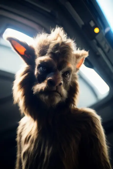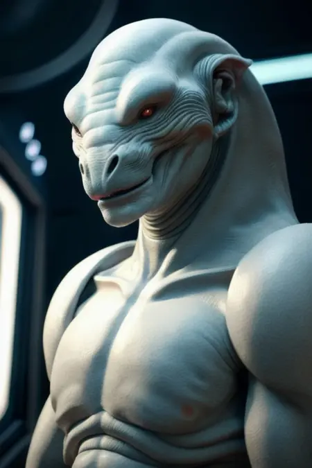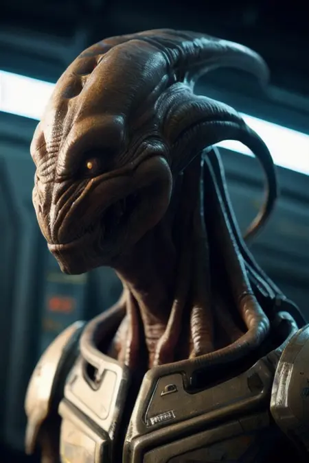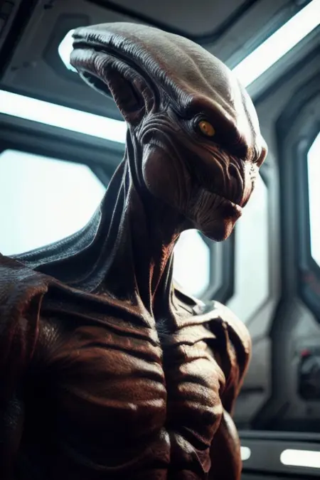 쇼를 위한 프롬프트 [당신의 콘텐츠로 교체하세요]: [[외계인/괴물 종류]]의 하이퍼 리얼리스틱 캔디드 사진, 관찰자 바라보기, scifi 우주정거장, 아날로그 스타일, 걸작, 마음이 아픈, 독일 각도, 초상화+, 시네마틱