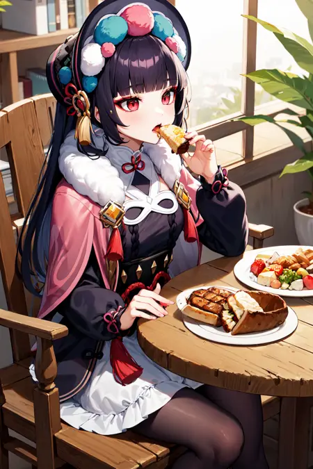 衣装1aayunjin, long hair, bonnet, tassel, makeup, fur trim, pink capelet, dress, long sleeves, purple pantyhose