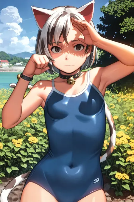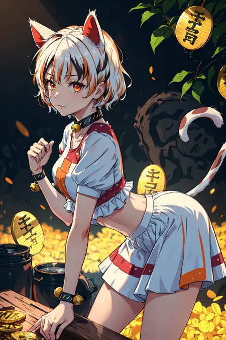 tag:1girl, cat ears,multicolored hair, white hair,short hair,orange eyes,neck bell,collar,crop top, multicolored shirt,short sleeves, navel,multicolored skirt, cat tail,calico,
