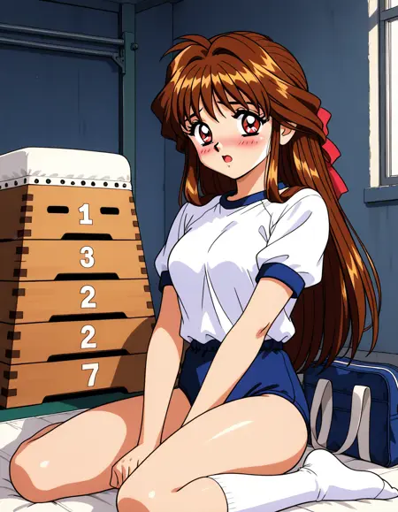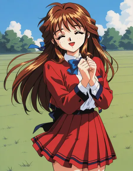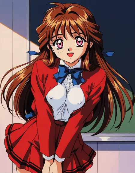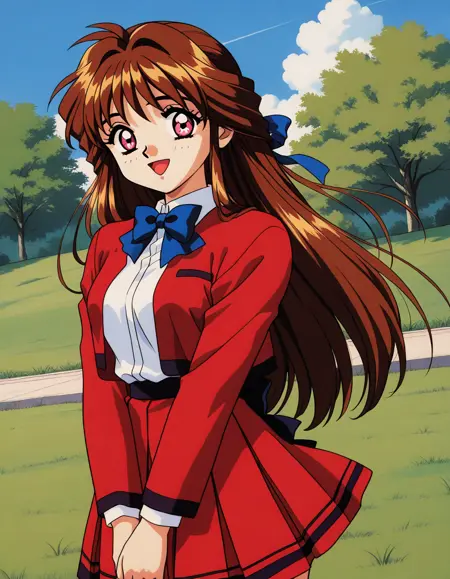 Minamizato_Ai(Anime), 1girl, solo, 긴 머리, 갈색 머리, 분홍 눈, 앞머리, 헤어 리본, 머리 끝, 중간 정도의 가슴, 1990년대 (스타일), 애니메이션 컬러링,