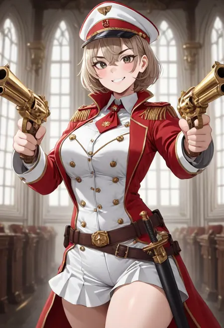 "Masterpiece (quality), 1boy, police uniform, holding two pistols, dual pistols, office in background"