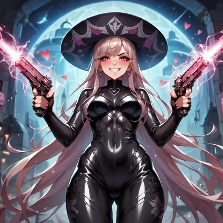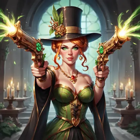 "score_9, score_8_up, score_7_up, score_6_up, score_5_up, score_4_up, (a close up shot of a beautiful witch with orange hair, wearing robe and clover tophat goldcoin in background, aiming pistol against the camera:1.2) magical castle in background, vibrant, concept art, digital art, realistic"