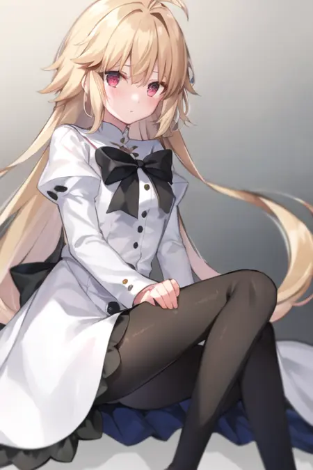 추천 프롬프트: 1girl, solo, 체인 목걸이\(아크에이드\), 검은 팬티스타킹, 흰색 긴팔 터틀넥 니ット sweeter, 파란 프릴 스커트, 관객을 바라보는 표정, 갈색 신발, 무릎 높이 부츠