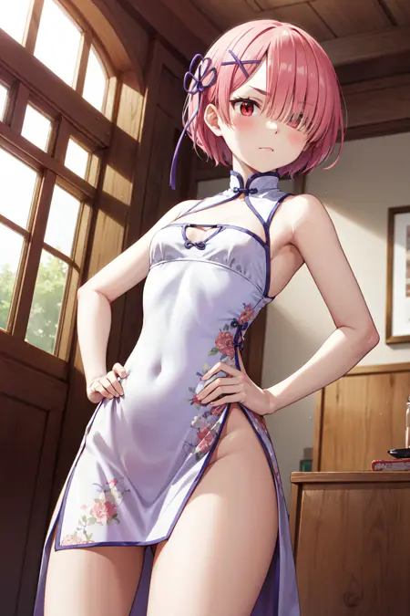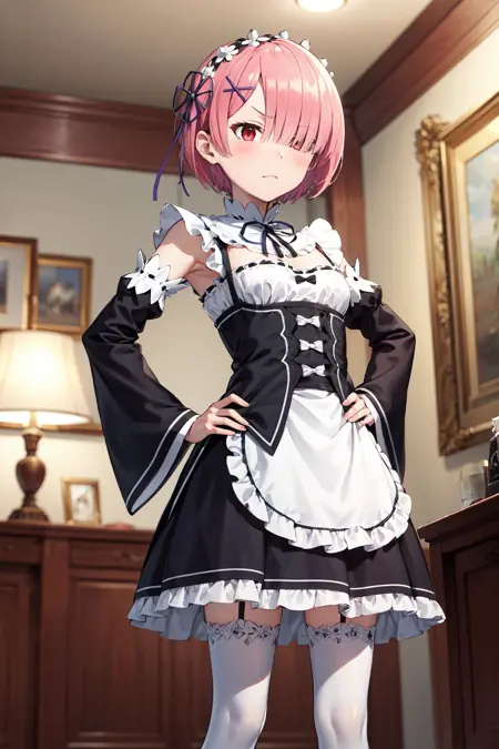 - aaram,short hair,hair over one eye,bangs,hair ribbon,purple ribbon,x hair ornament,small breasts,roswaal mansion maid uniform,maid,neck ribbon,dress,frills,detached sleeves,long sleeves,(apron:1.2),skirt,white thighhighs,shoes