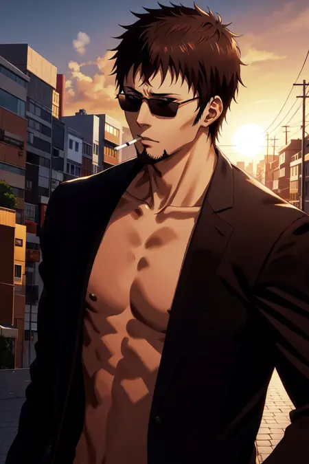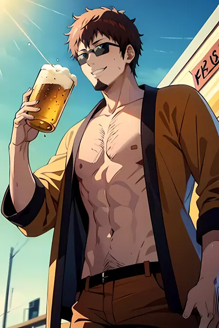 Help Promts: 1Man, Small Beard, Geta, , Brown Pants, Middle Aged, Brown Haori, Dark Glasses, Brown Hair, Short Hair, Japan, bare_belly.