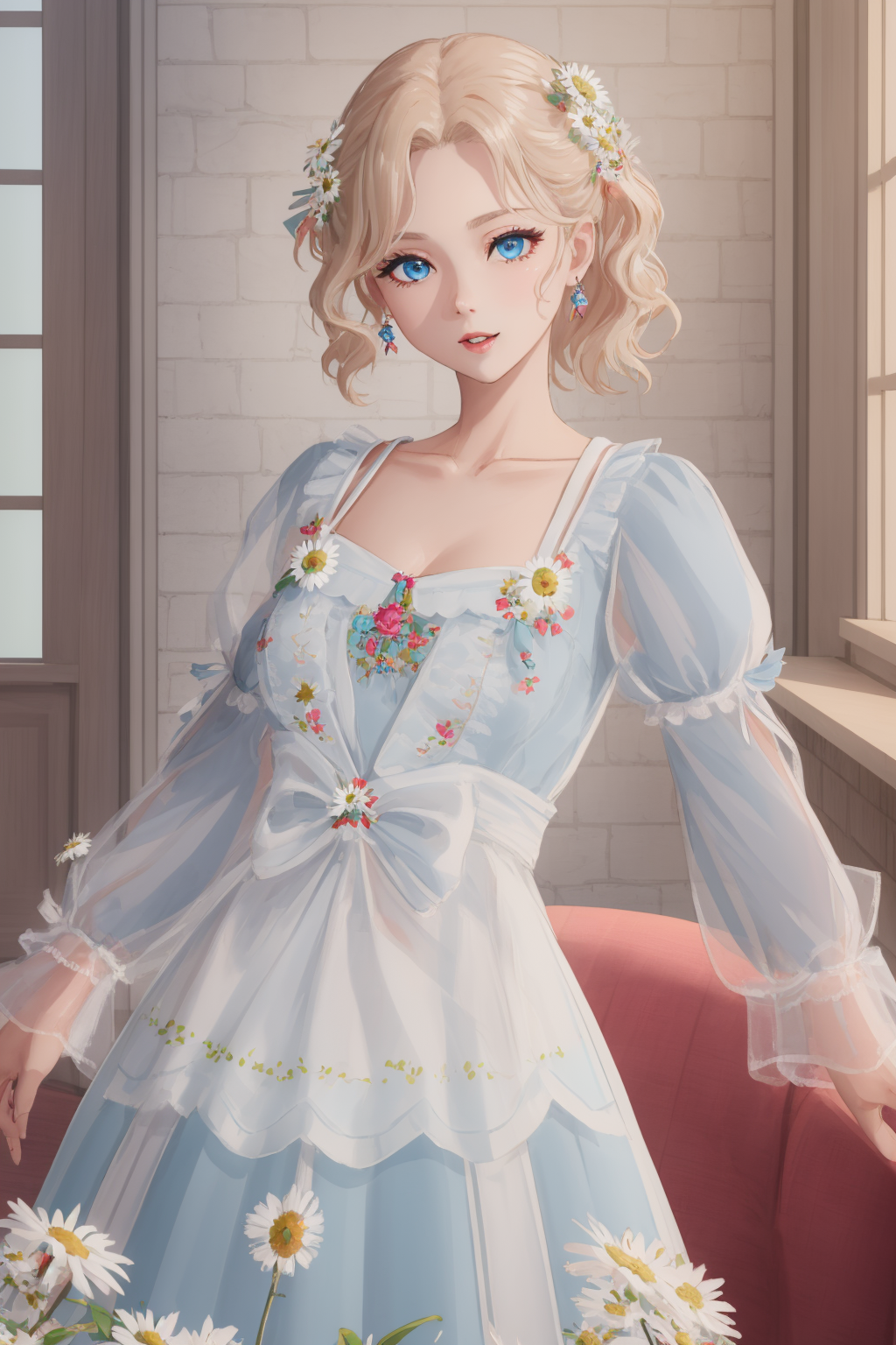 dress, bouffont dress, transparent long sleeves, daisies, cherry,