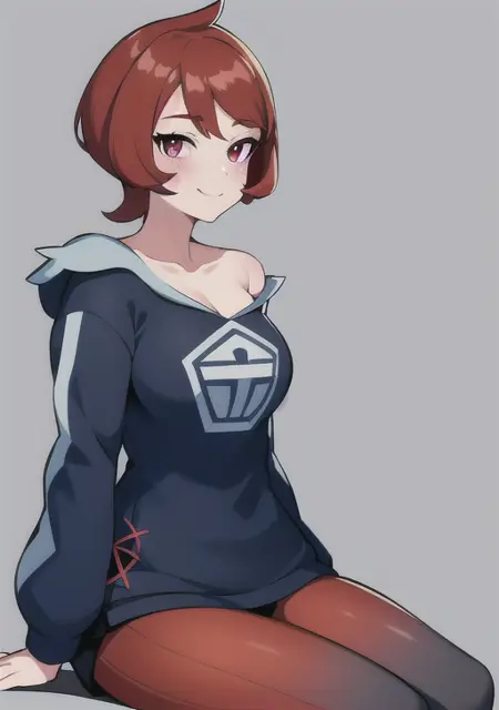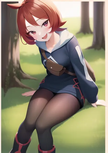 사용된 프롬프트: arezu, 1girl, solo, breasts, looking at viewer, blush, smile, short hair, open mouth, bangs, red eyes, long sleeves, sitting, collarbone, jacket, :d, heart, pantyhose, red hair, boots, outdoors, shorts, day, shiny, hand up, hood, bag, black footwear, tree, hoodie, arm support, border, grass, white border, bush, legwear under shorts, blue hoodie, brown bag, cowlick, pantyhose under shorts, gradient clothes, gradient legwear