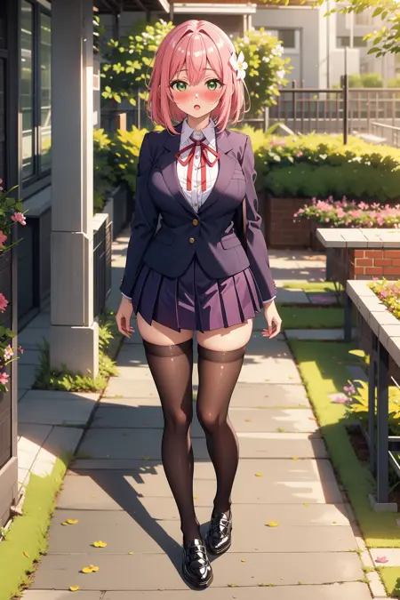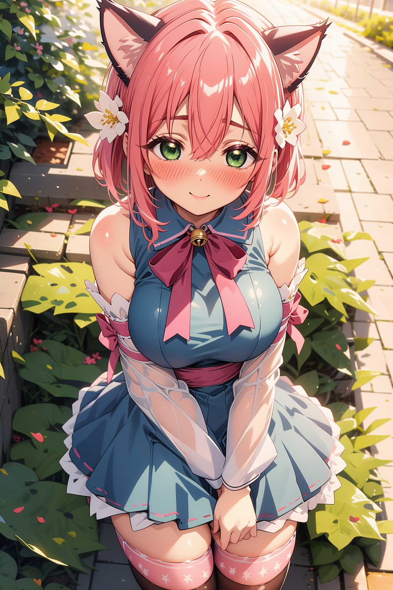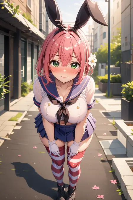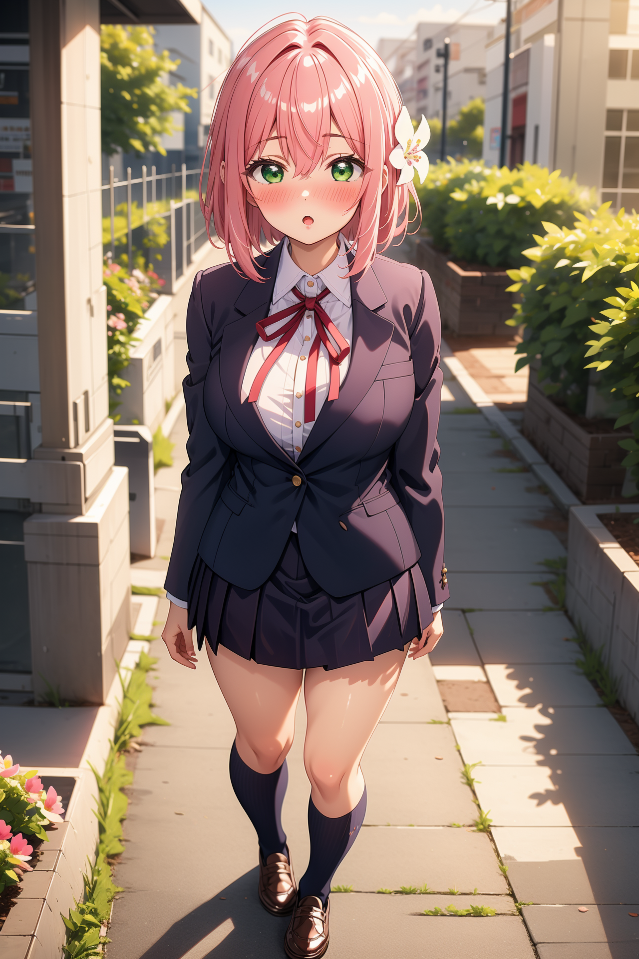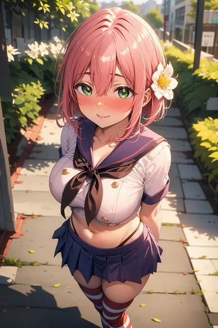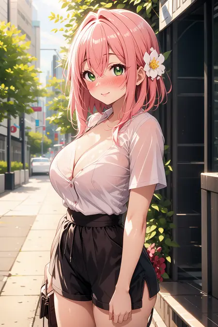 appearance: hanazono hakari, short hair, pink hair, hair between eyes, hair flower, hair ornament, green eyes, large breasts,