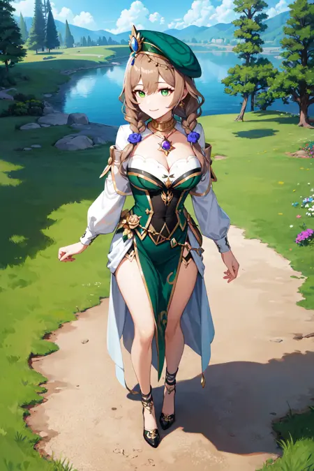 衣装2bblisa, long hair, twin braids, hair flower, green eyes, beret, green headwear, jewelry, green dress, long sleeves, white sleeves