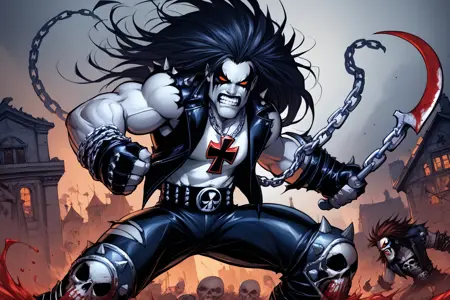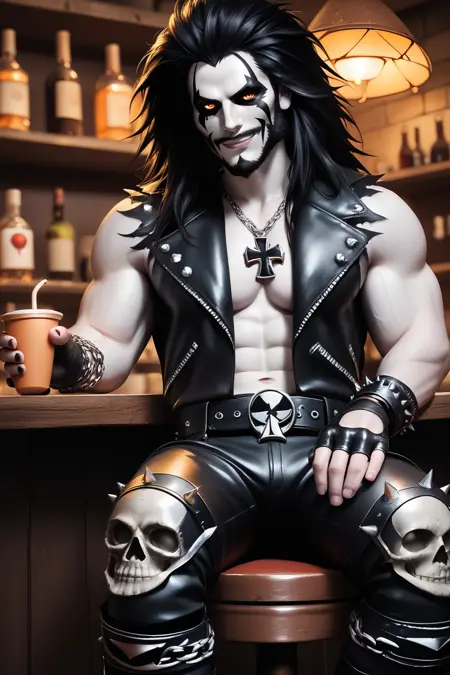 Trigger : lobo with long hair, face paint, glowing red eyes, wearing rockeroutfit leather jacket armor chains and spikes skulls, smoking cigar