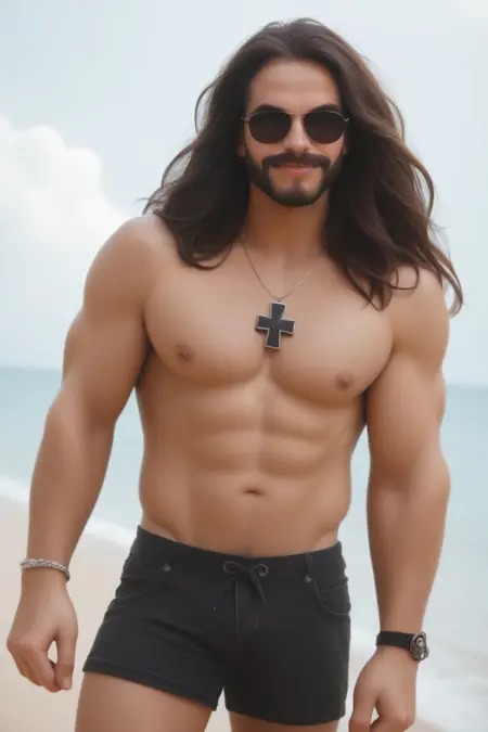 Trigger : lbo, pale skin, long hair, face paint, beard, leather vest, fingerless gloves, chains, skulls, belt, leather pants, knee pads, iron cross necklace, buckle, spikes, boots, shirt