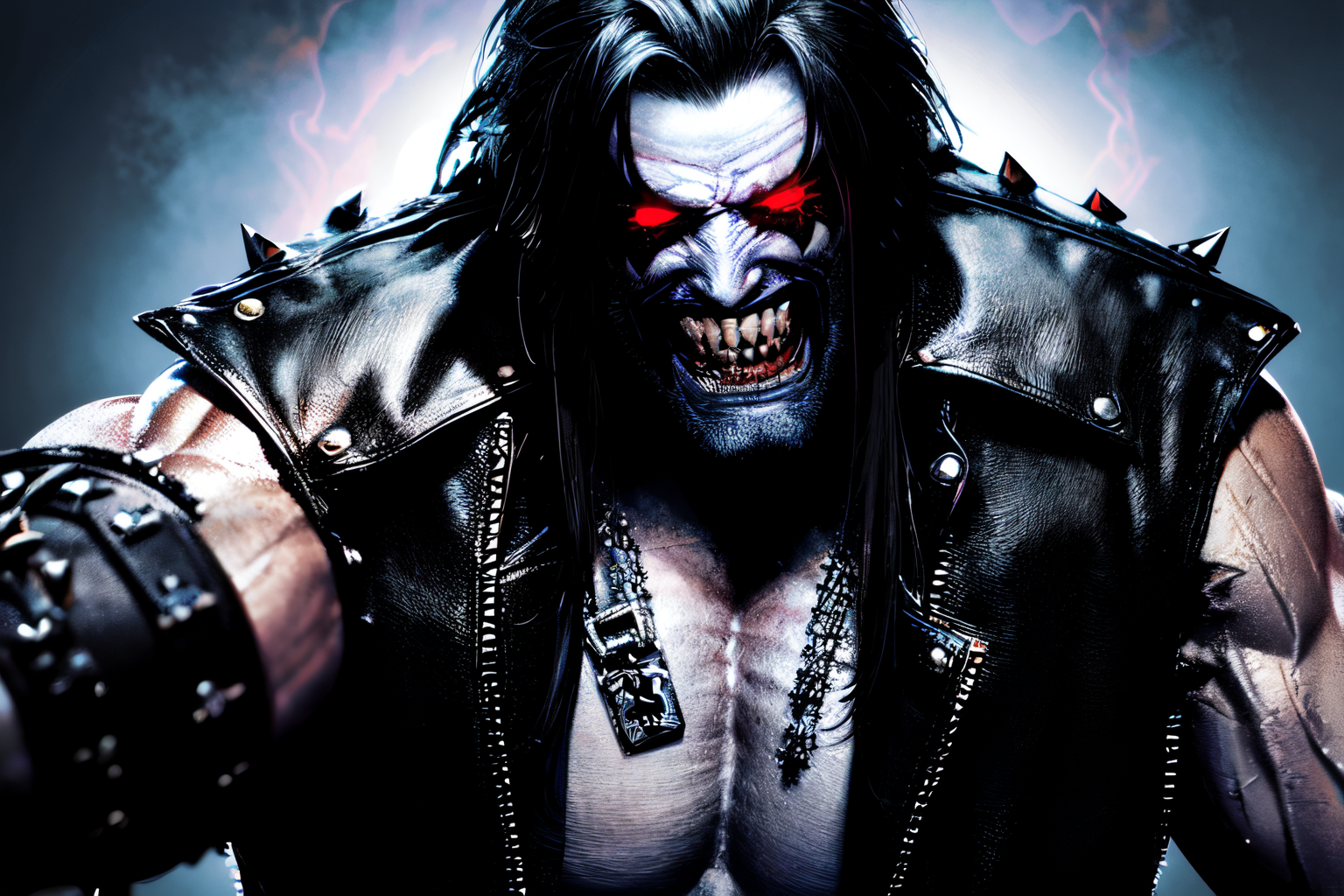 Trigger : lobo with long hair, face paint, glowing red eyes, wearing rockeroutfit leather jacket armor chains and spikes skulls, smoking cigar