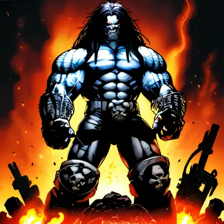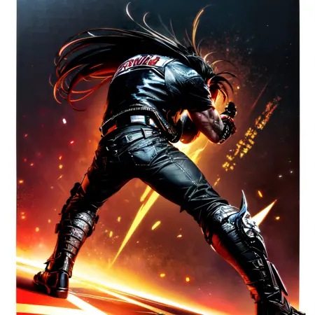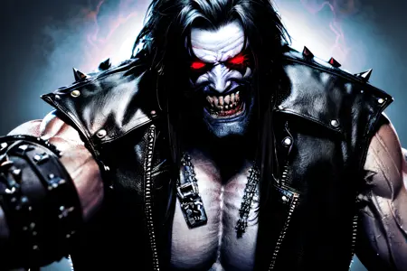 - トリガー:lbo、薄い肌、長い髪、顔のペイント、ひげ、レザーのベスト、指なし手袋、鎖、頭蓋骨、ベルト、レザーのズボン、膝パッド、鉄のクロスのネックレス、バックル、突起、ブーツ、シャツ