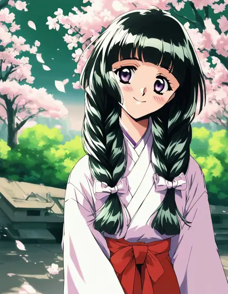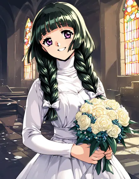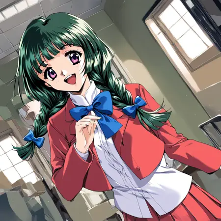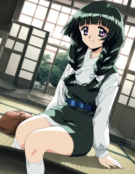 Kamiyama_Miko(kakyuusei), 1girl, solo, dark green hair, long hair, purple eyes, twin braids, white bow, blunt bangs, hair bow, medium breasts,