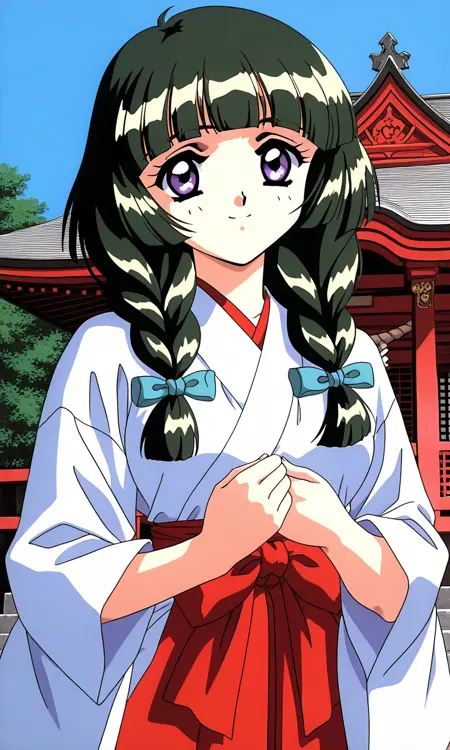 Kamiyama_Miko(kakyuusei), 1girl, solo, dark green hair, long hair, purple eyes, twin braids, white bow, blunt bangs, hair bow, medium breasts,