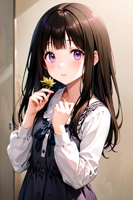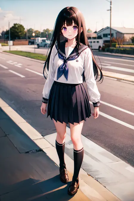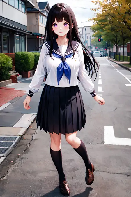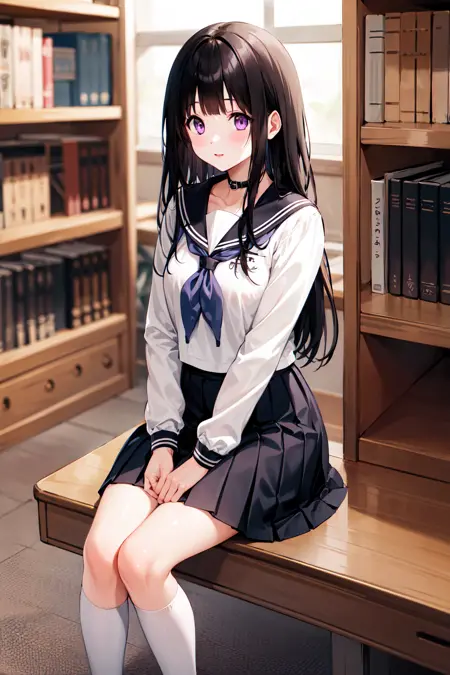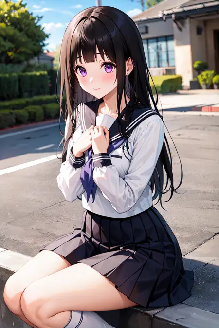 1girl, 志志尾惠介, 长发, 黑发, 校服, 紫色眼睛, 白色衬衫, 白色袜子, 百褶裙, 刘海, 黑色水手领, 领结, 黑色裙子, 长袖