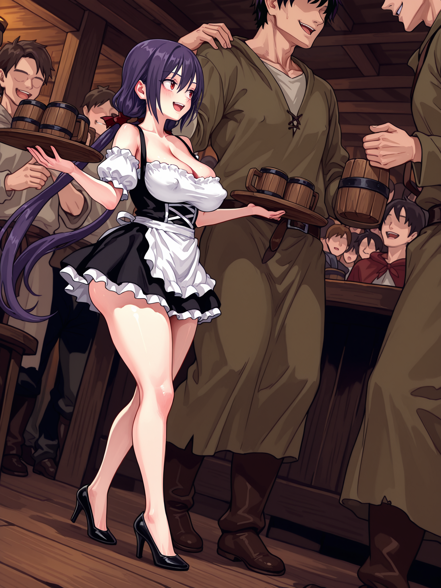 Pony XL: long eyelashes, maid, german clothes, dirndl, jade necklace, jewelry, black hair, purple hair, back twintails, low twintails, red eyes, hair between eyes, very long hair, bare shoulders, white top, black corset, scrunchie, large breasts, (pointy breasts, cleavage:1.5), saggy breasts, covered nipples, apron, (short skirt, thighs:1.5), bare legs, frills, brown loafers, black shoulder straps, detached sleeves, puffy sleeves, short sleeves, white sleeves, white panties,