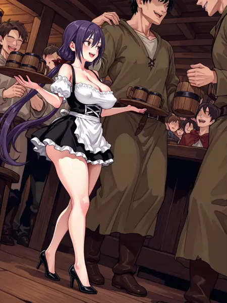 Anya (アーニャ) Illustrious XL: reanya, purple hair, red eyes, hair between eyes, low twintails, very long twintails, bare shoulders, maid, dirndl, german clothes, miniskirt, frilled skirt, white apron, black footwear, high heels, red scrunchies, large breasts, saggy breasts, cleavage, (covered nipples, erect nipples, puffy nipples, large nipples:1.3), wide hips, thighs, bare legs, necklace,