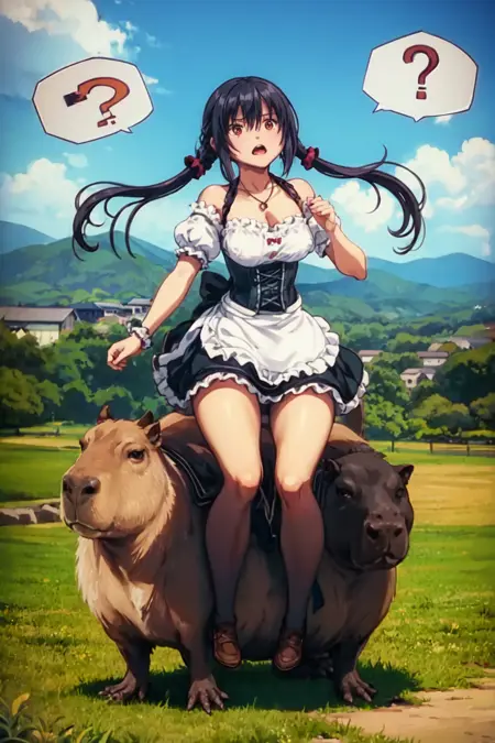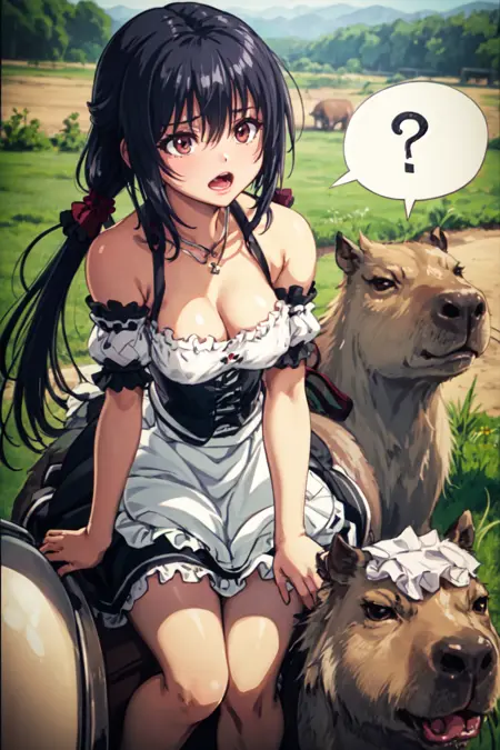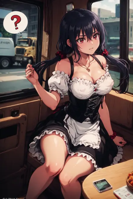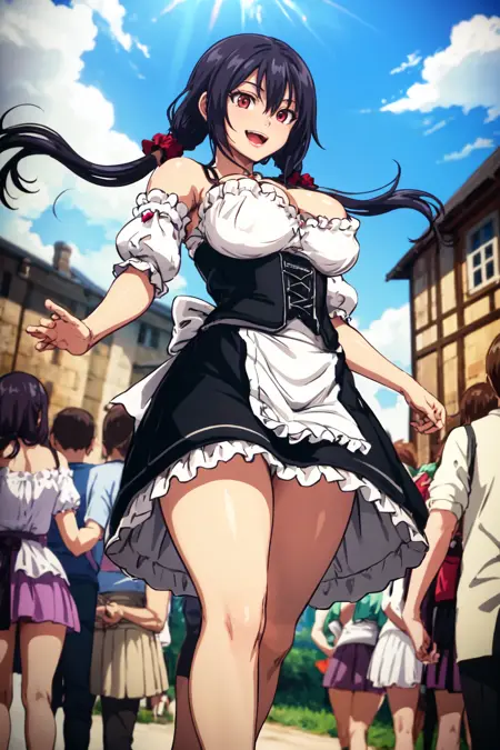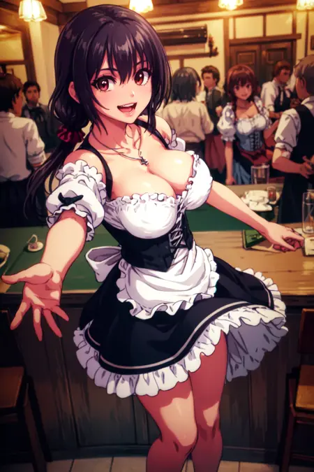 Pony XL: 长睫毛,女仆,德国服饰,连衣裙,翡翠项链,珠宝,黑色头发,紫色头发,后双马尾,低双马尾,红色眼睛,头发在眼睛间,极长头发,裸露肩膀,白色上衣,黑色紧身胸衣,发圈,大乳房,(尖锐乳房,胸部显露:1.5),下垂乳房,遮盖乳头,围裙,(短裙,大腿:1.5),裸腿,褶边,棕色乐福鞋,黑色肩带,分离袖子,蓬松袖子,短袖,白色袖子,白色内裤