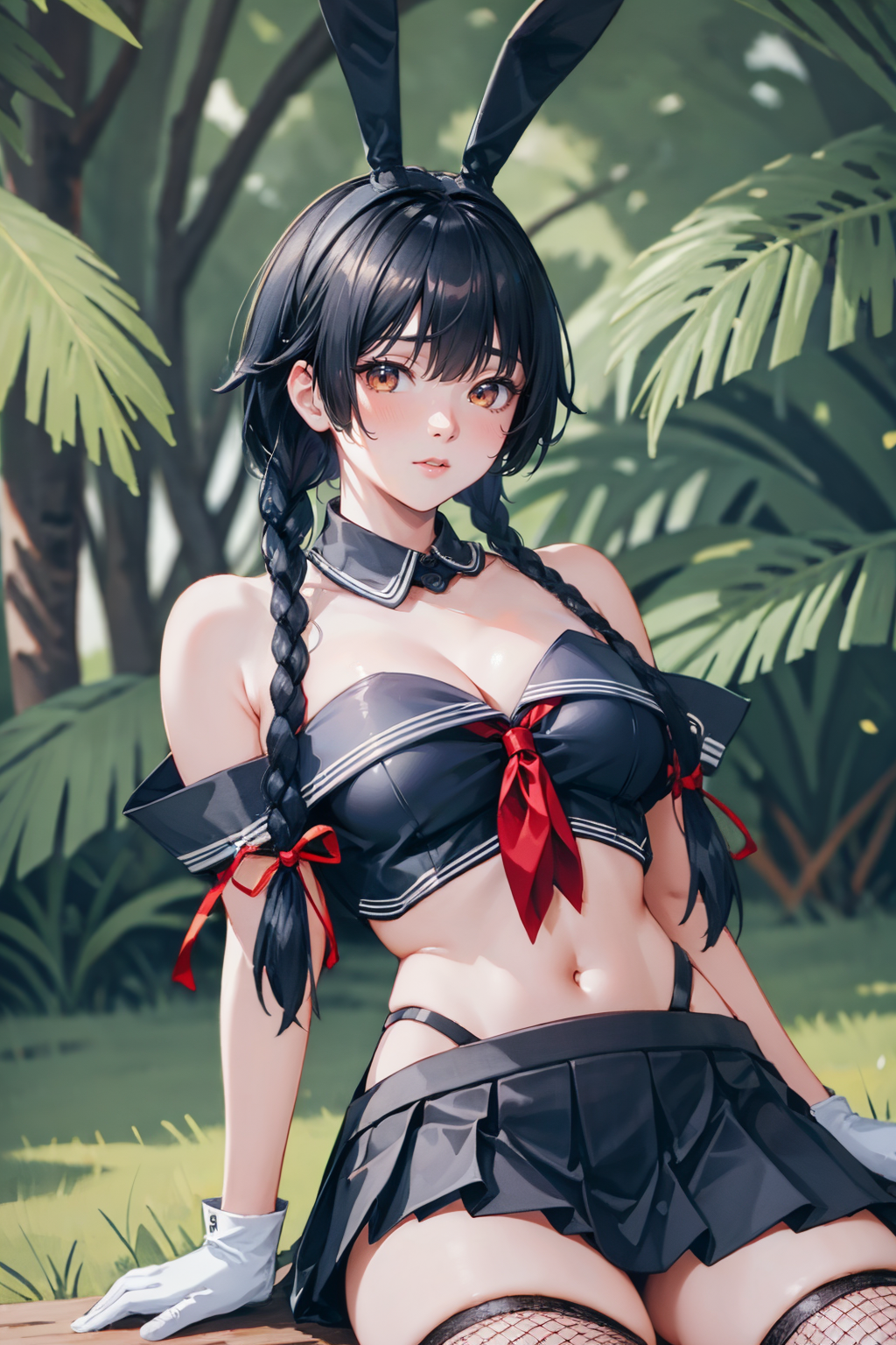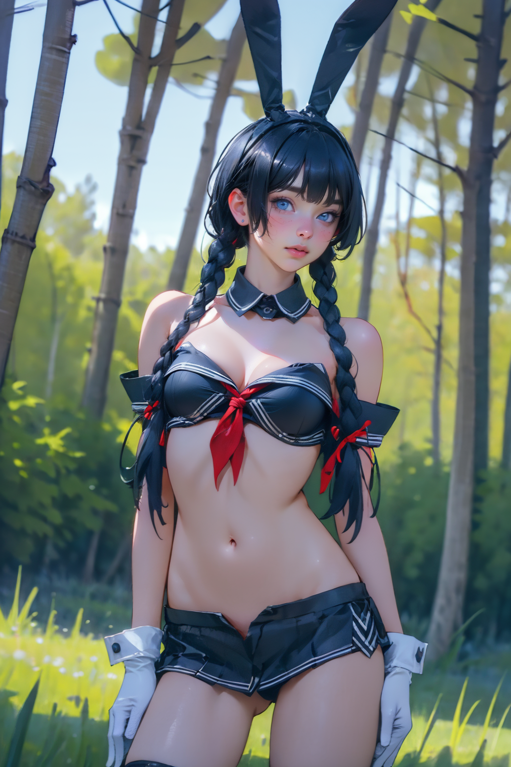 ruanyi0002,rabbit ears,navel,pleated skirt,school uniform,bare shoulders,