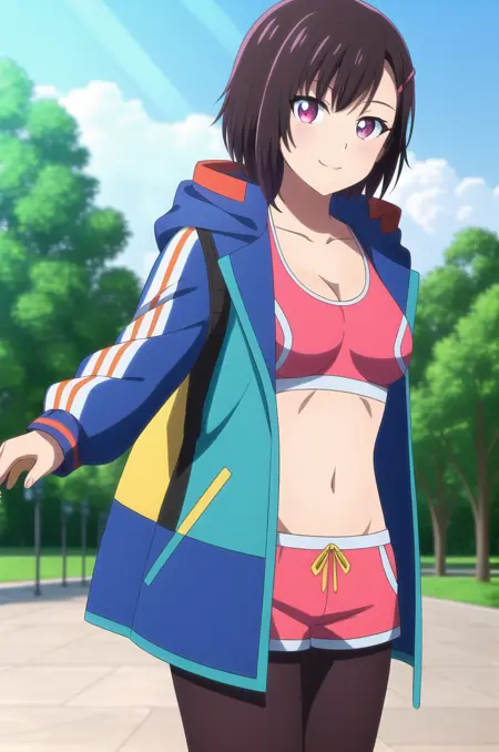 outfit_1, 후oodie 자켓, 트랙 자켓, 후드 내려짐, 열린 자켓, 다채로운 자켓, 긴 소매, 분홍색 스포츠 브라, 어깨뼈, 가슴, 허리, 배꼽, 분홍색 반바지, 노란색 끈, 생식기, 반바지 아래 다리 착용, 검은 레깅스, 스니커즈,