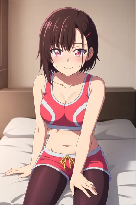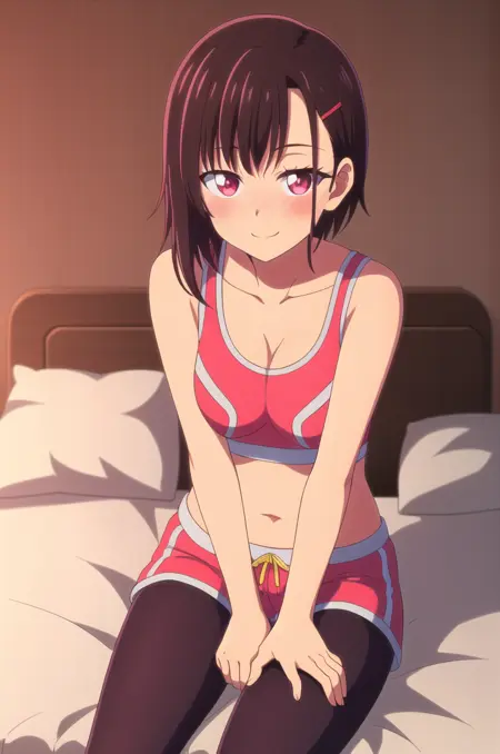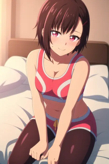 outfit_1, 어깨 노출, 분홍색 스포츠 브라, 어깨뼈, 가슴, 허리, 배꼽, 분홍색 반바지, 노란색 끈, 생식기, 스니커즈,