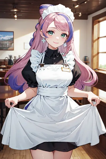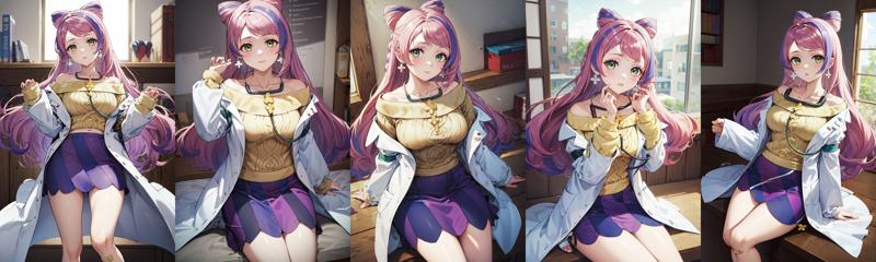 - aamiriam,multicolored hair,long hair,hair bun,bangs,earrings,large breasts,stethoscope,labcoat,white coat,open clothes,yellow sweater,off shoulder,long sleeves,sleeves past wrists,skirt,purple skirt,bandaid,bandaid on leg,sandals