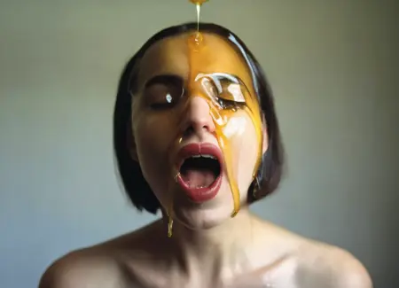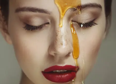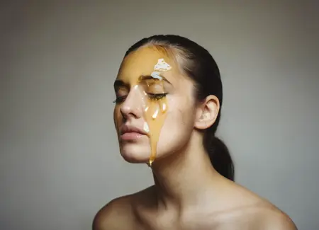 1girl, face covered with honey, realistic, black hair, simple background, portrait, lips, grey background