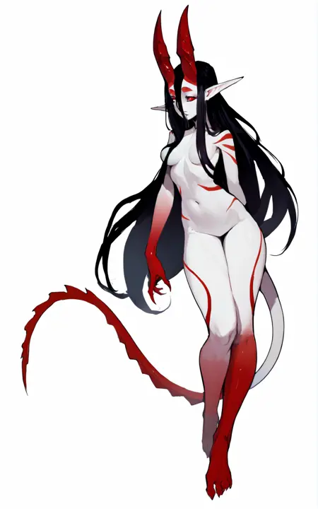 강화 태그: 뿔, 색상이 있는 피부, 붉은 눈, 뾰족한 귀, 꼬리, 긴 머리카락, 검은 머리카락, 평평한 가슴, 하얀 피부, 눈 사이의 머리카락, 몬스터 소녀, 다색 피부, 검은 공막**
