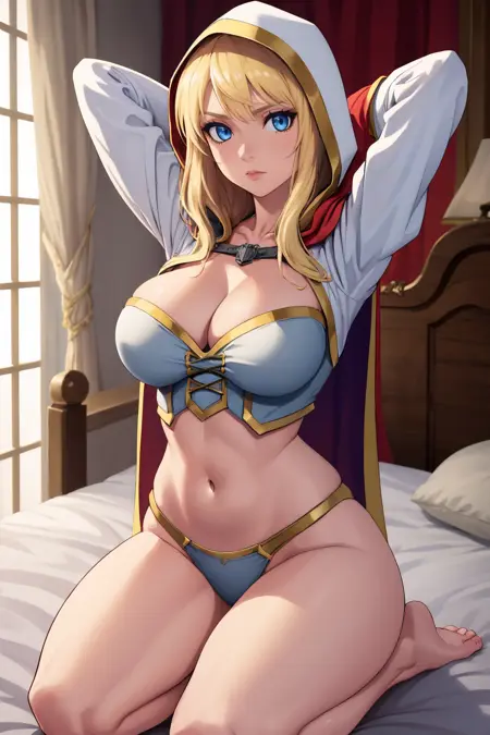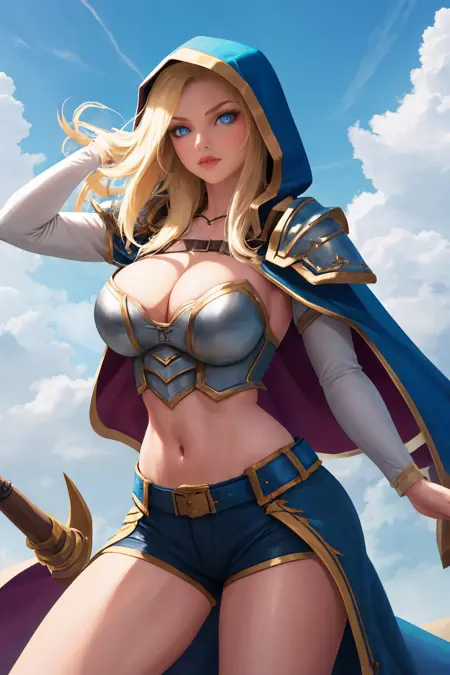 jainapre, blonde hair, hood, cleavage, shoulder armor, capelet, midriff, navel