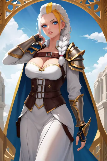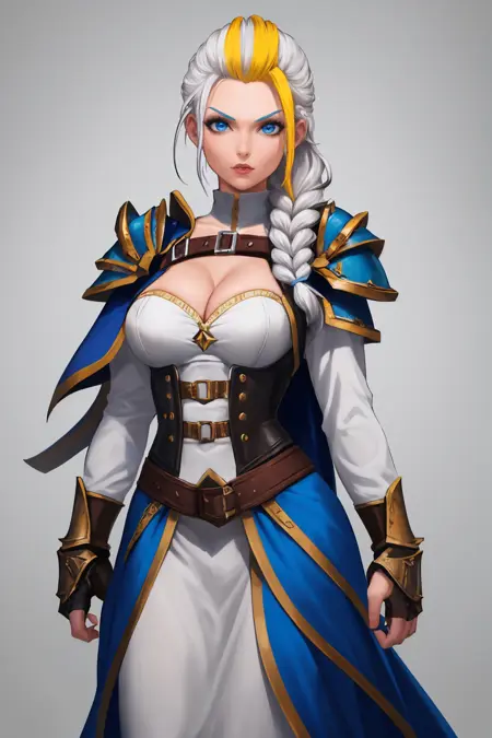 jainapost, multicolored hair, white hair, single braid, chest strap, cleavage, armor, corset, blue cape, gauntlets, long sleeves